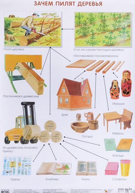Этот плакат расскажет детям зачем в лесу пилят деревья. Великолепные яркие иллюстрации обязательно заинтересуют ребят.
