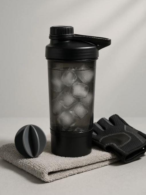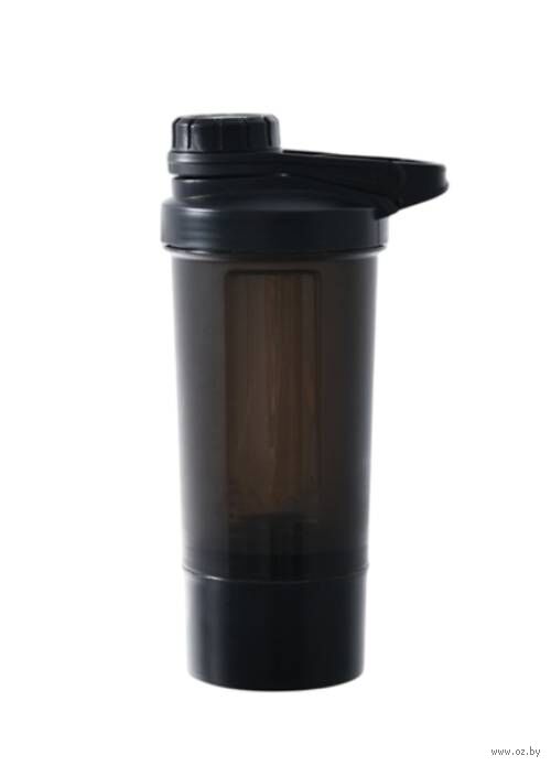 Этот спортивный шейкер отличается функциональностью и стильным дизайном. Он оснащен отделением для хранения добавок или порошков в нижней части, а также металлическим шариком для смешивания.