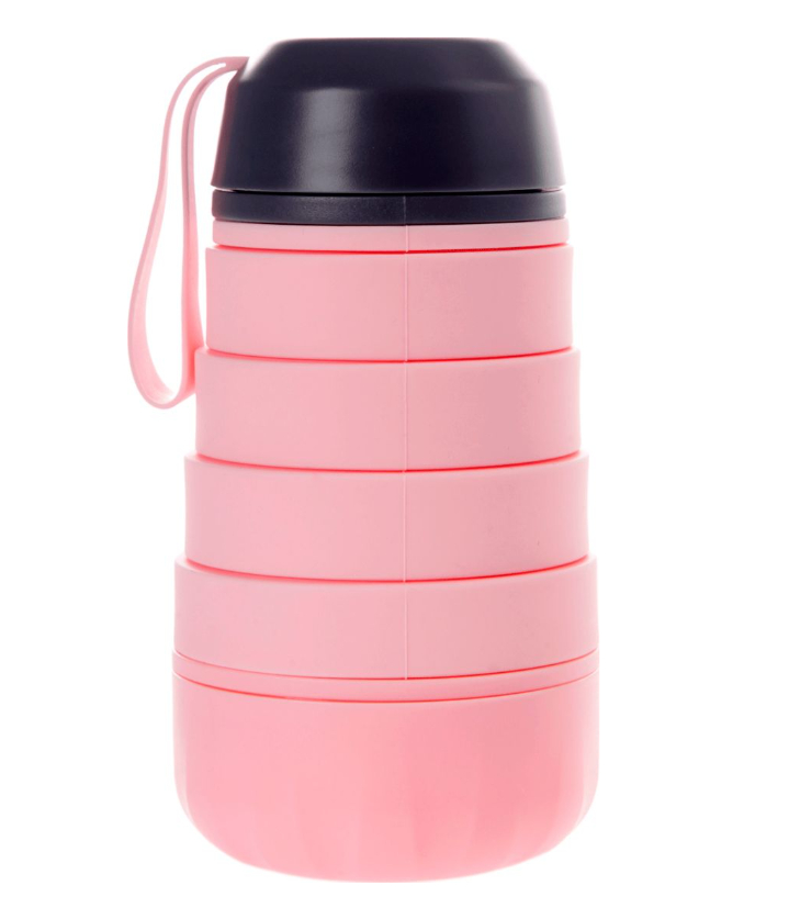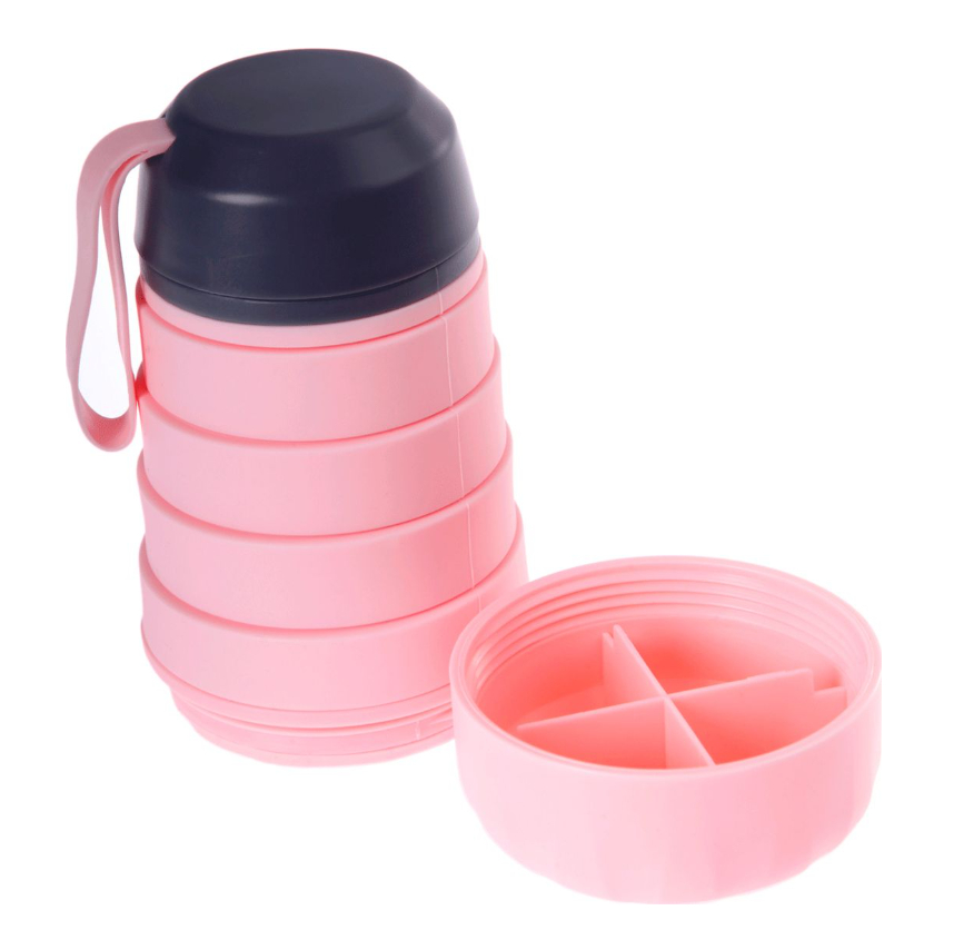 Уникальная силиконовая бутылка – незаменимый аксессуар для сторонников активного образа жизни! Она сочетает в себе преимущества многоразовой бутылки и таблетницы. Нижний отсек откручивается – в нем вы можете разместить лекарства или витамины, которые необходимо принять в течение дня. Складная бутылка очень компактна и практически не занимает места в сложенном виде, а в разложенном вмещает 400 мл воды.