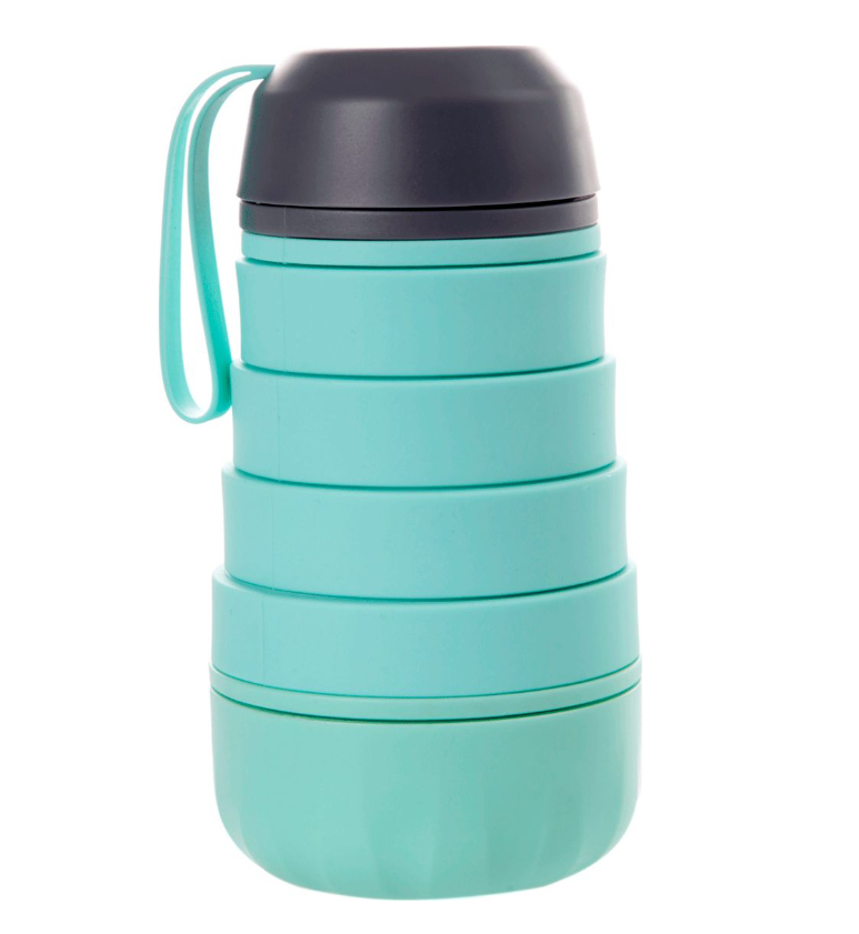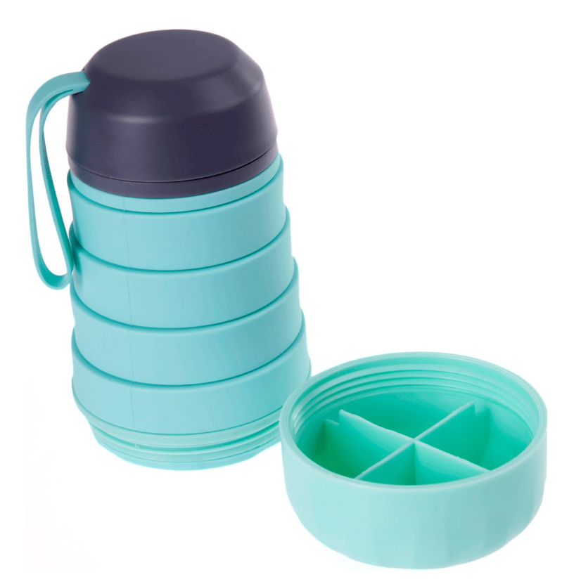 Уникальная силиконовая бутылка – незаменимый аксессуар для сторонников активного образа жизни! Она сочетает в себе преимущества многоразовой бутылки и таблетницы. Нижний отсек откручивается – в нем вы можете разместить лекарства или витамины, которые необходимо принять в течение дня. Складная бутылка очень компактна и практически не занимает места в сложенном виде, а в разложенном вмещает 400 мл воды.