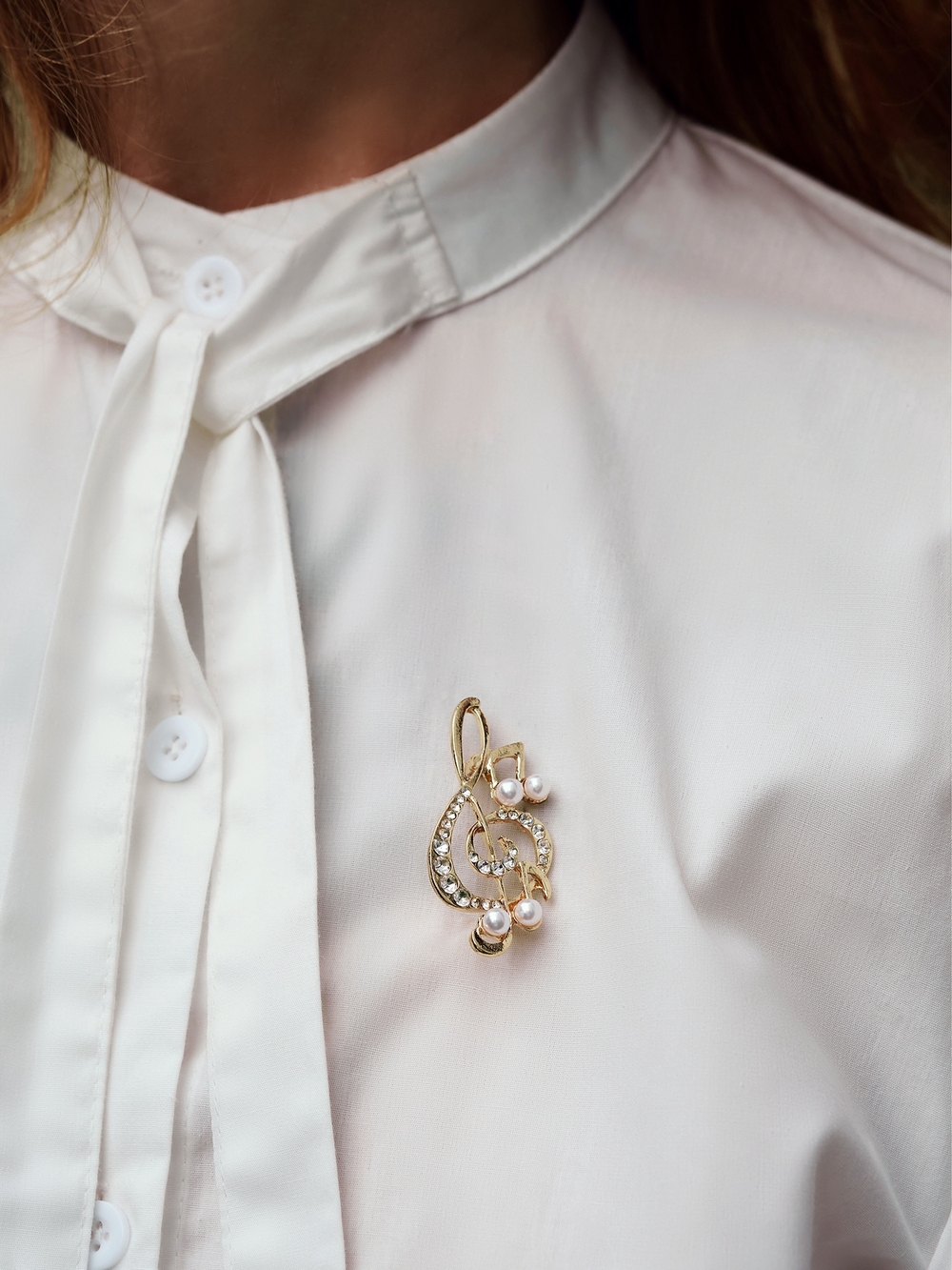 Погрузитесь в мир музыки и стиля с великолепной брошью в форме скрипичного ключа, которая станет изысканным акцентом вашего образа. Это украшение, выполненное в белом цвете с золотой фурнитурой и жемчужными нотками, привнесет нотку утонченности и оригинальности в любой наряд. Длина броши составляет 5,5 см, что делает её идеальной для повседневного использования и особых случаев.