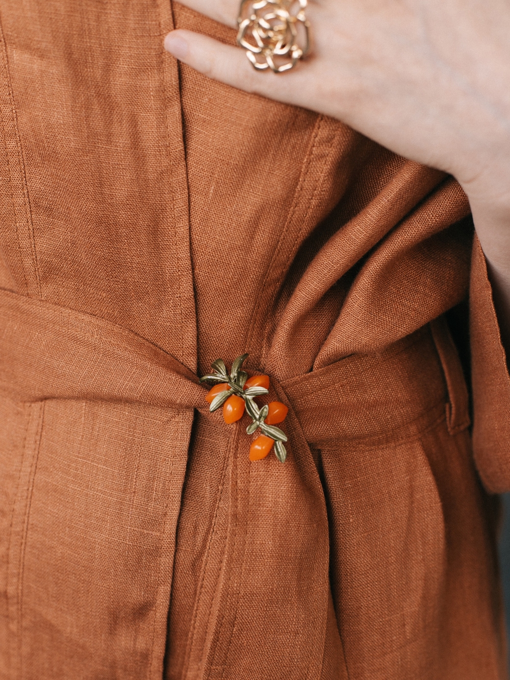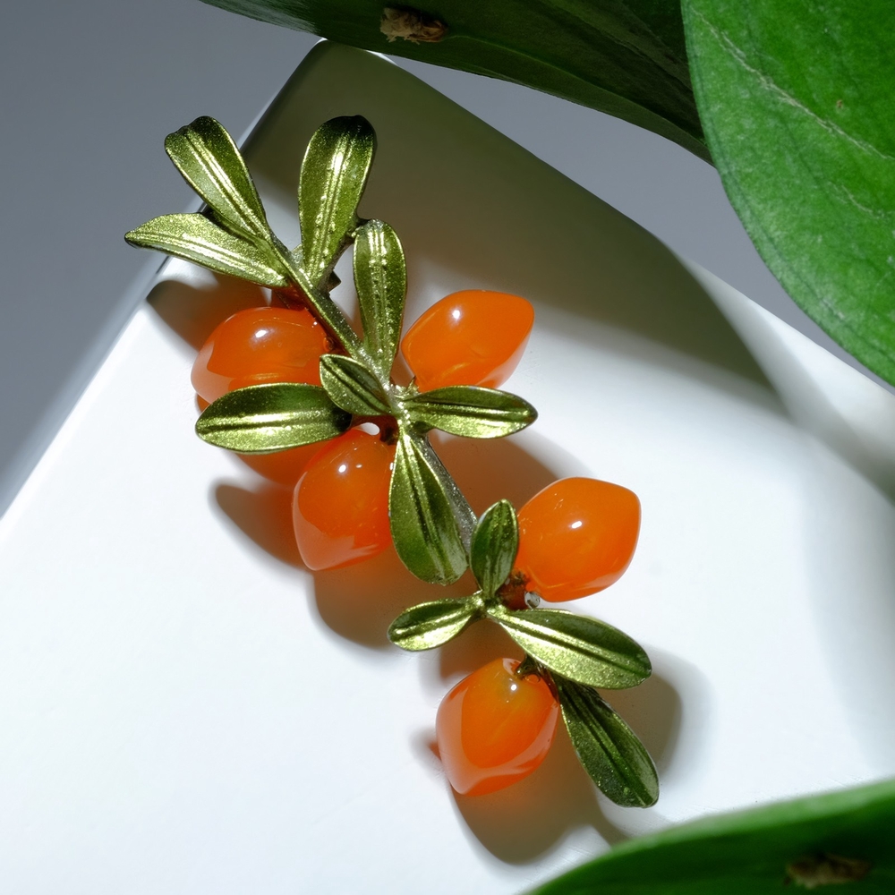 Брошь в ярких оранжево-зелёных тонах с серебристой фурнитурой вдохновлена природной свежестью облепихи. Её длина 6 см создаёт выразительный акцент, который привлекает внимание и гармонично дополняет любой женский образ, будь то повседневный или праздничный.