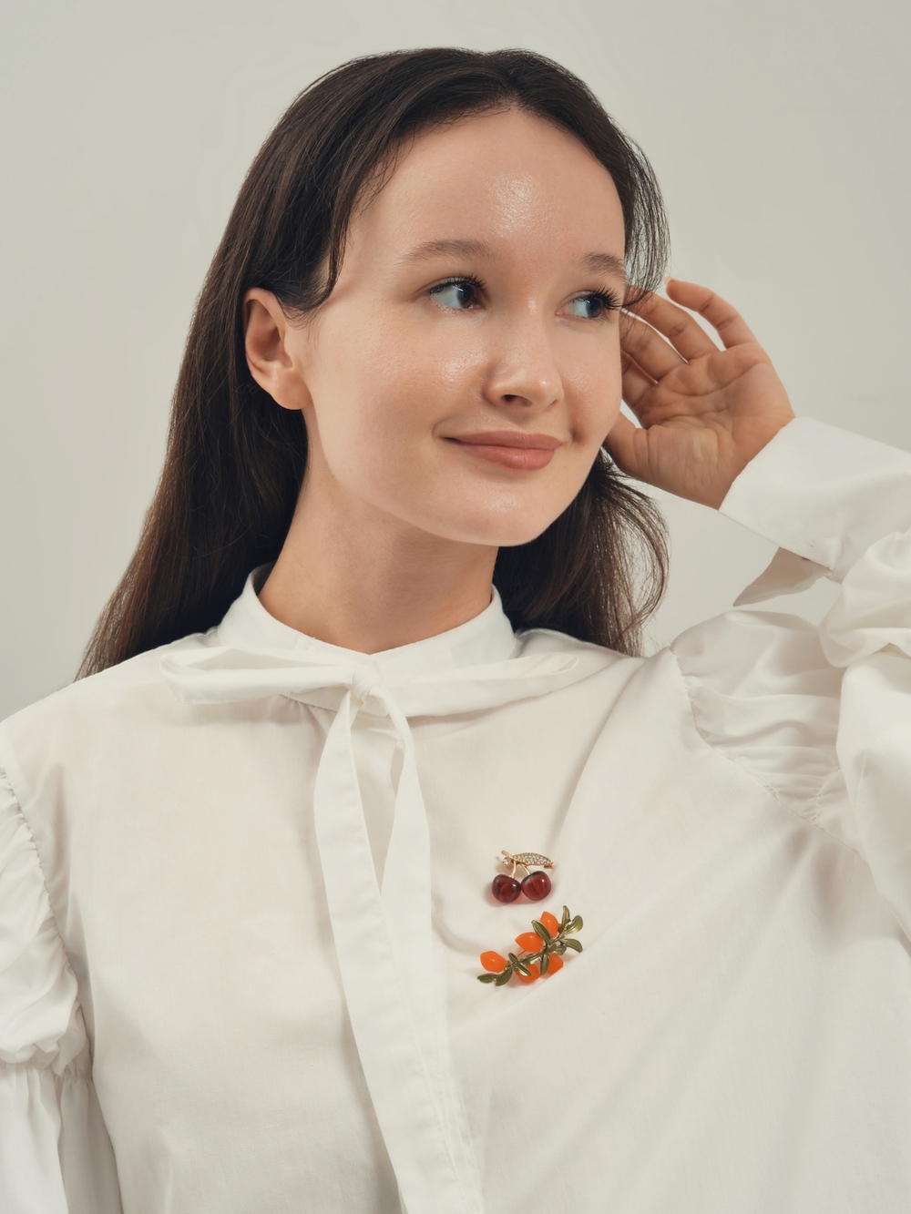 Металлическое основание с серебряным покрытием обеспечивает прочность и стильный блеск, а вставки из пластика и эмали придают изделию насыщенность цвета и лёгкую фактурность. Такая комбинация материалов создаёт эффект живой ягоды, раскрывая тему фруктов и ягод с особой яркостью и естественностью.