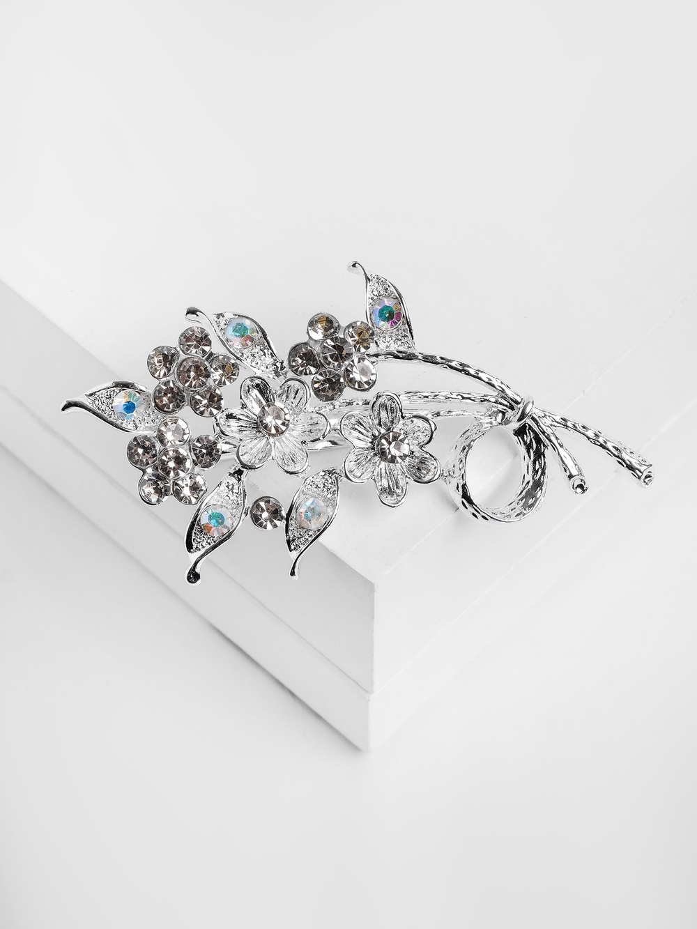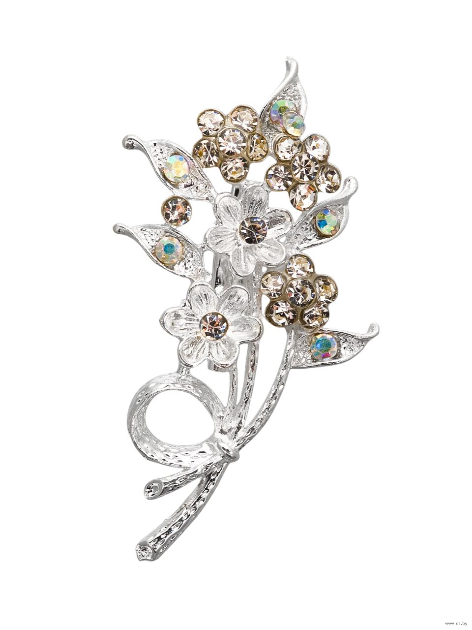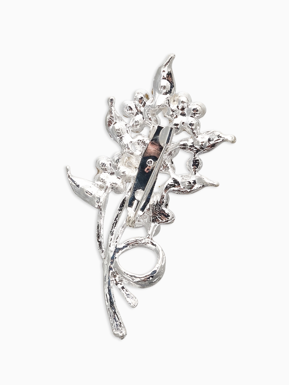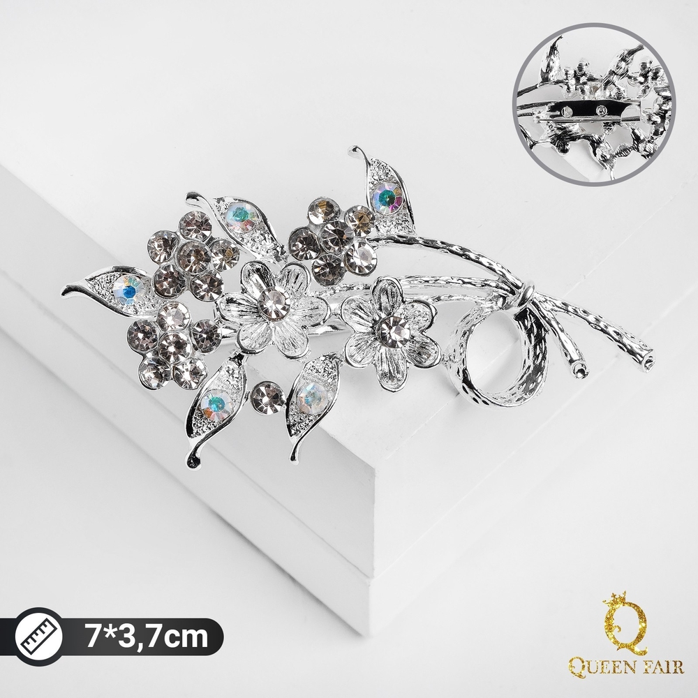Нежная брошь с изображением цветов на ветке очаровывает своей белоснежной гаммой, дополненной серебристым металлическим блеском, создавая композицию, которая дышит свежестью и изяществом. Размером 7 см, она украшена сверкающими стразами, что делает её идеальным акцентом для тех, кто ценит природную красоту и утончённость в аксессуарах.