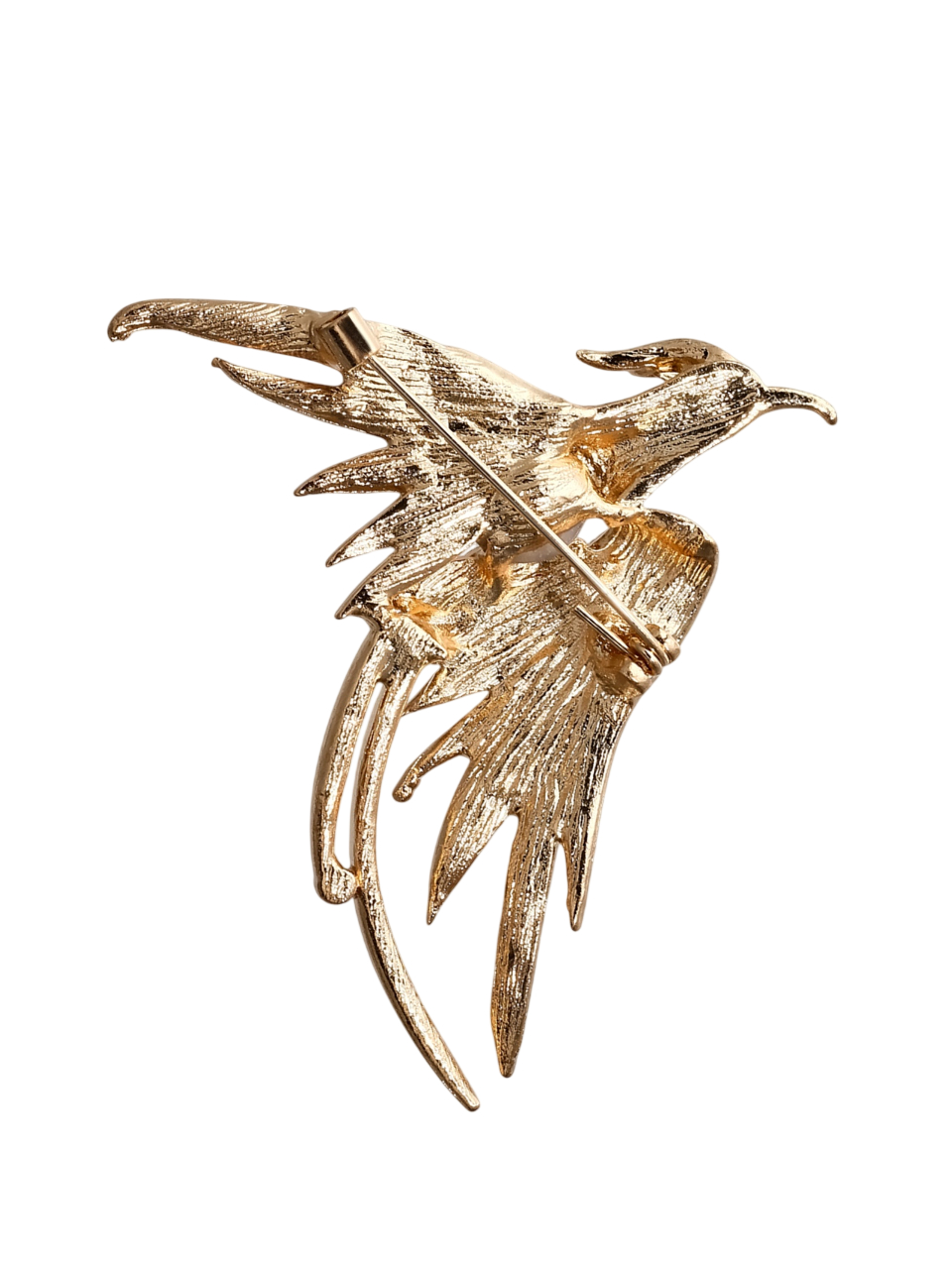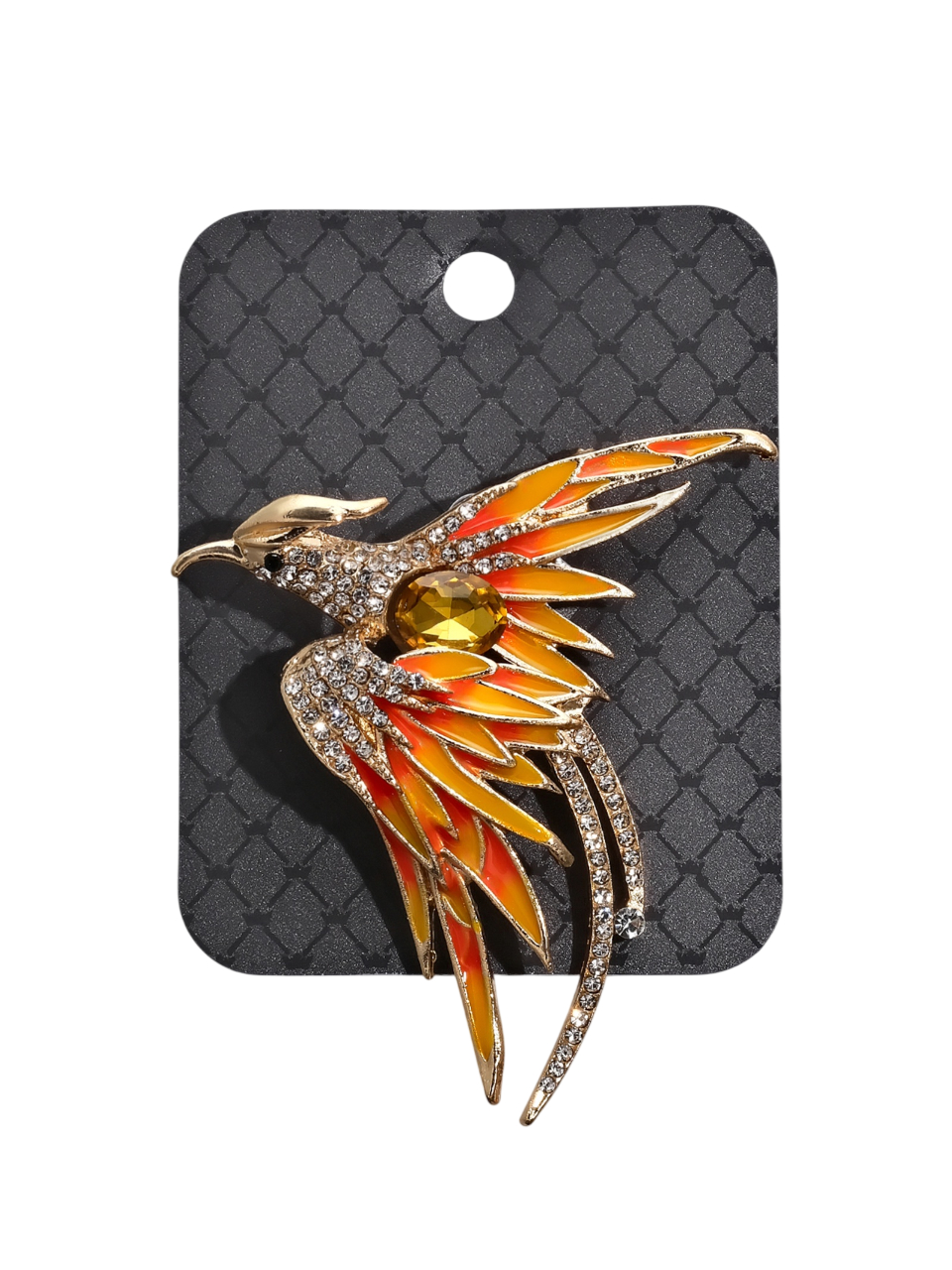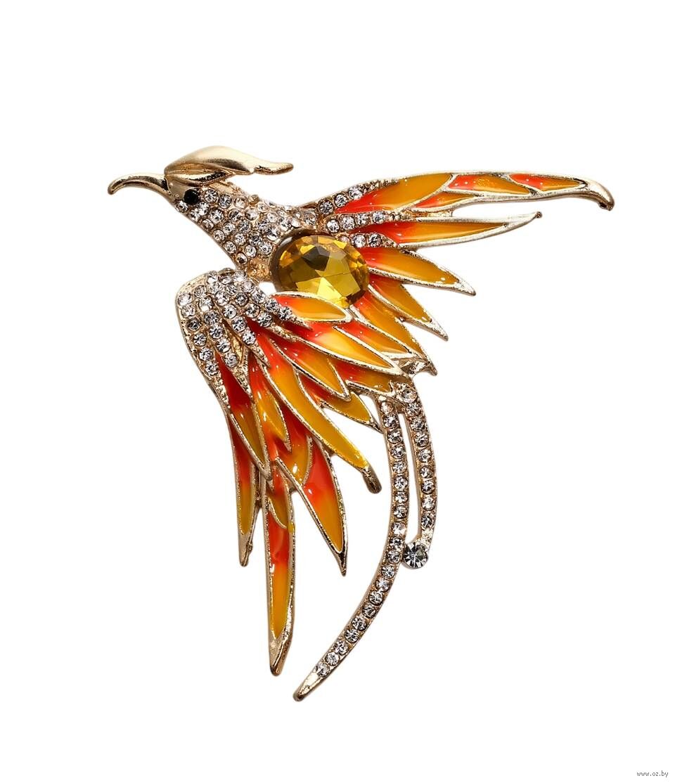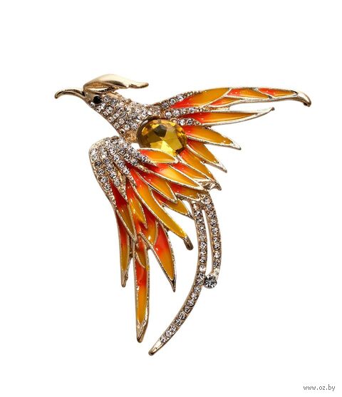 Символ возрождения и силы в элегантном исполнении. Яркая брошь с изображением огненной птицы в жёлто-белых тонах и золотистой оправе станет выразительным украшением для женщин, подчёркивая индивидуальность и тепло образа.