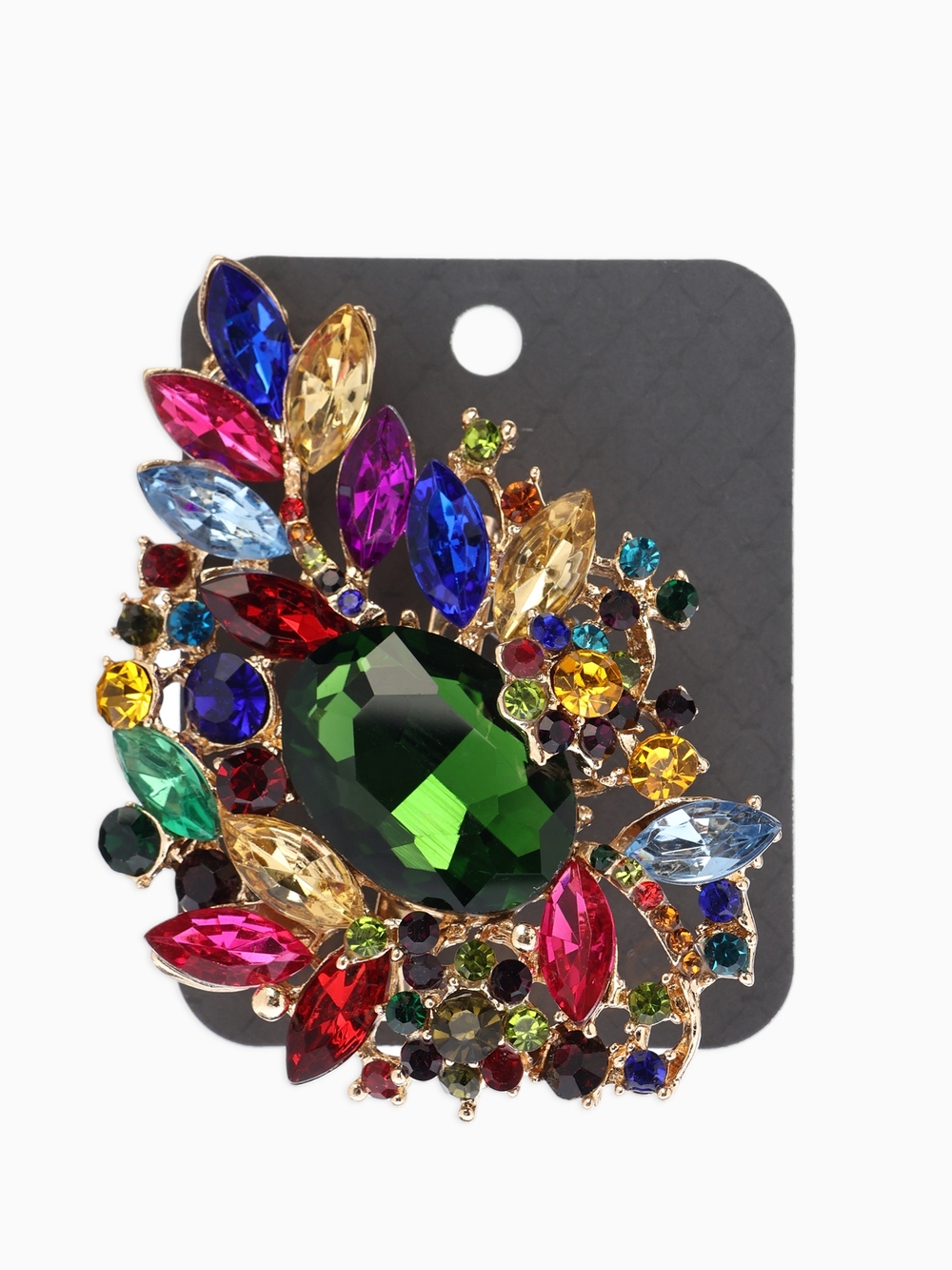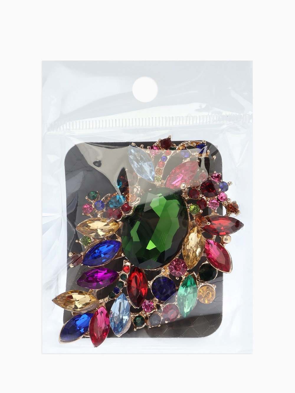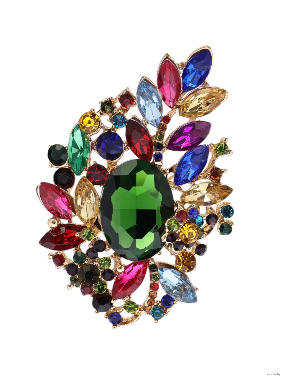 Многоцветная симфония. Окружение центрального камня напоминает раскрывшийся бутон, лепестки которого украшены стразами и стеклом рубиновых, сапфировых, аметистовых и янтарных тонов. Разнообразие форм и размеров вставок создает динамичную игру света.