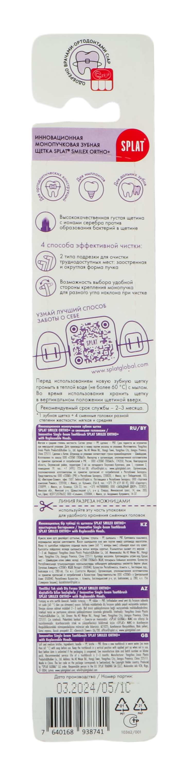 Эргономичная ручка монопучка сконструирована так, чтобы можно было вкручивать головку с щетиной с двух сторон – для подбора удобного угла расположения монопучка при гигиене полости рта. Дополнительные съемные насадки также позволяют сократить количество используемого пластика в упаковке. Антибактериальное покрытие с ионами серебра предотвращает размножение бактерий, вызывающих кариес, в щетине.
