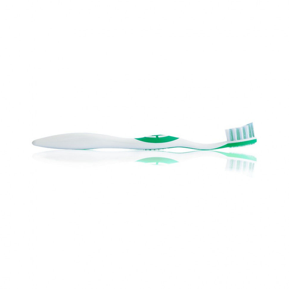 Мягкая силиконовая поверхность с внешней стороны головки зубной щетки для дополнительной гигиены языка и щек.