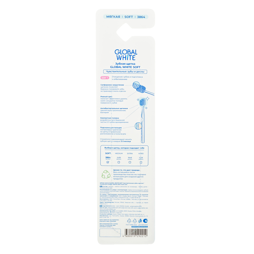 Зубная щетка изготовлена из мягкой щетины, что идеально подходит при чувствительности зубов и десен. Сапфировое закругление щетинок позволяет бережно полировать зубы, не травмируя эмаль и десны.