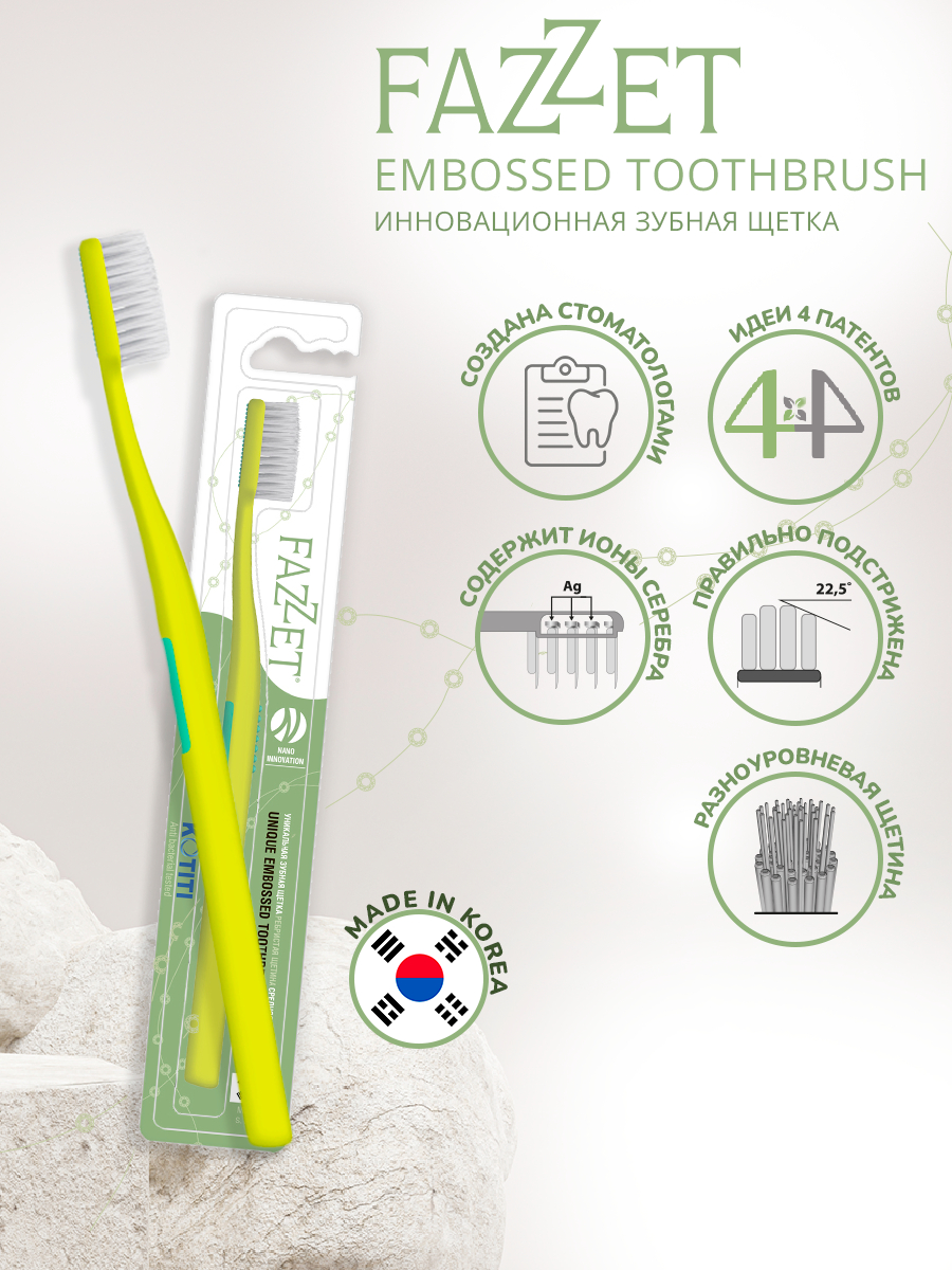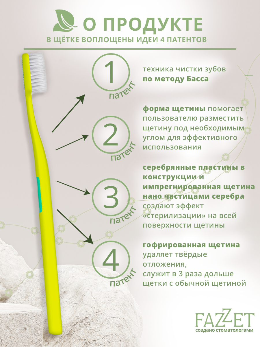 Инновационная зубная щетка с ребристой, рельефно подстриженной щетиной разработана с учетом рекомендаций по уходу за полостью рта от ведущих стоматологов.