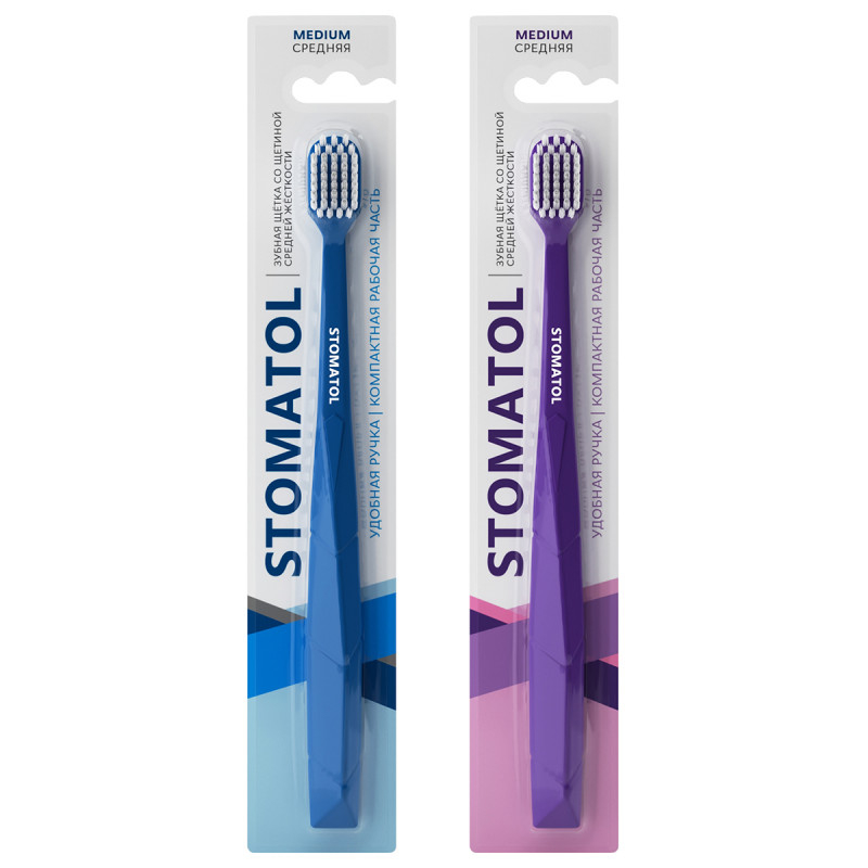 Щетка Stomatol Medium представлена в двух цветах: синяя и фиолетовая.