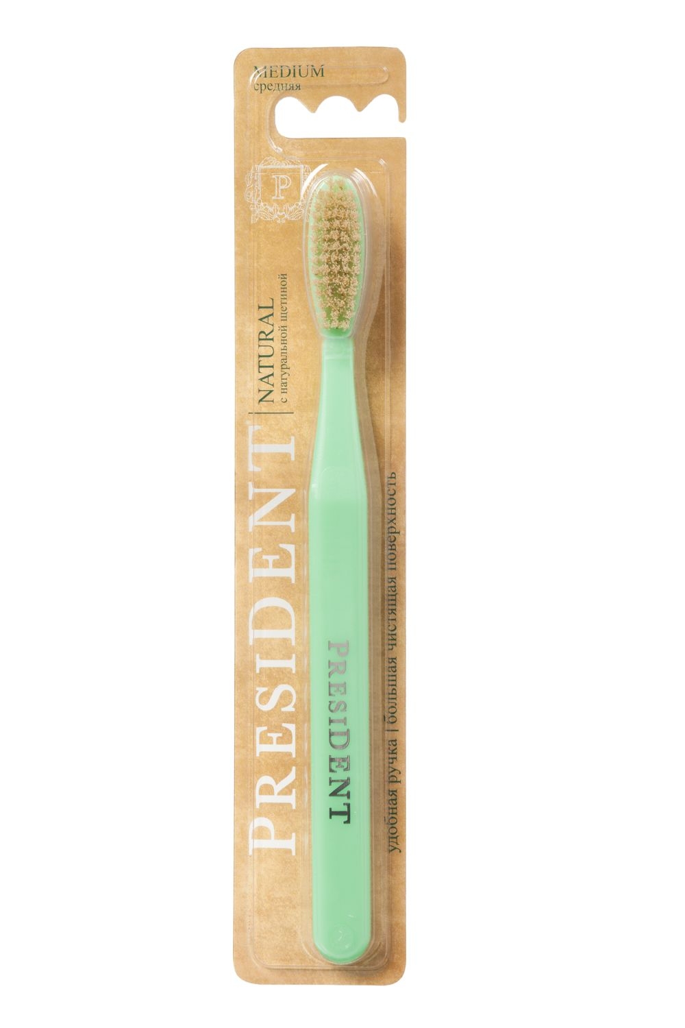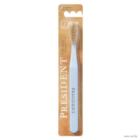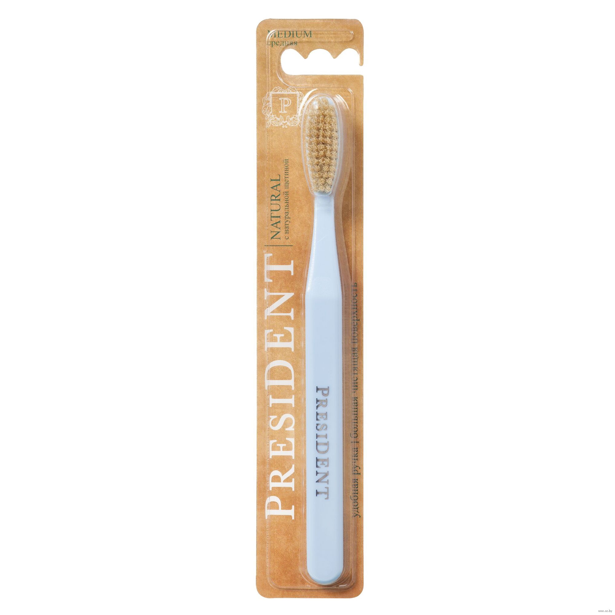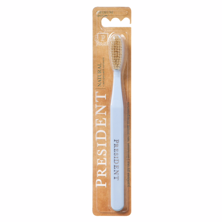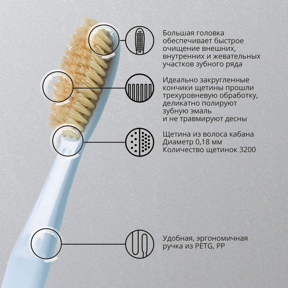 Зубная щетка с натуральной щетиной. Большая головка обеспечивает быстрое очищение внешних, внутренних и жевательных участков зубного ряда. Закругленные щетинки деликатно полируют зубную эмаль и не травмируют десны.