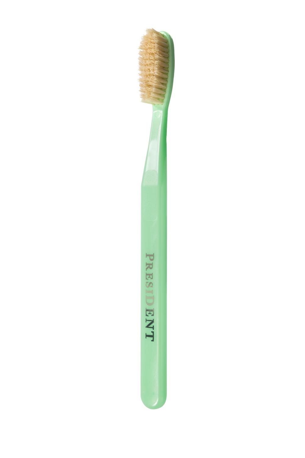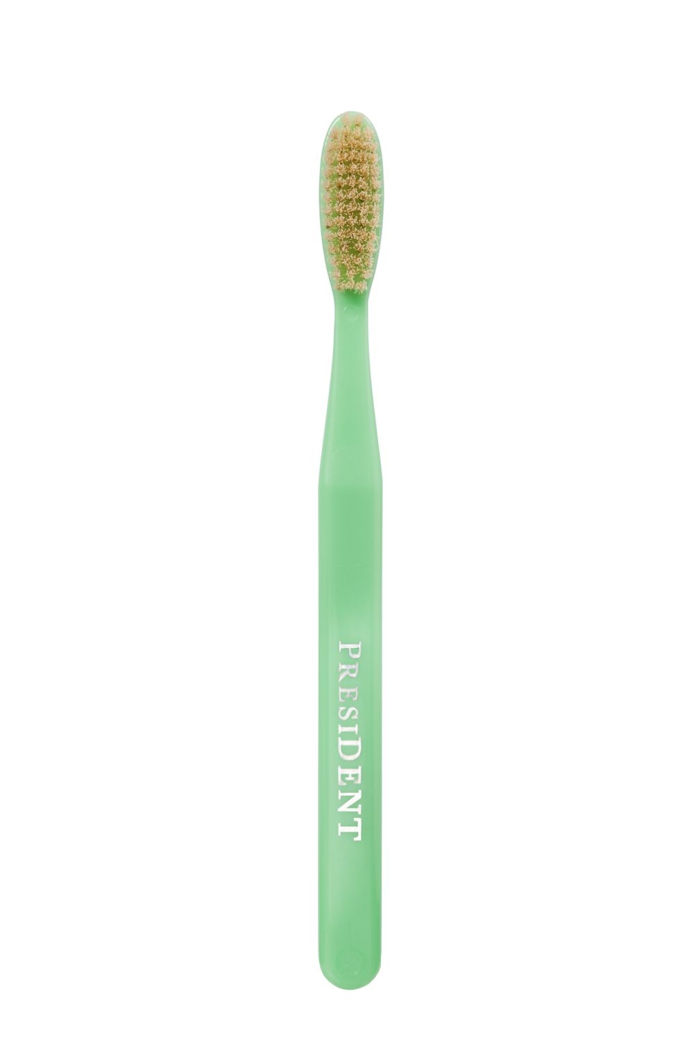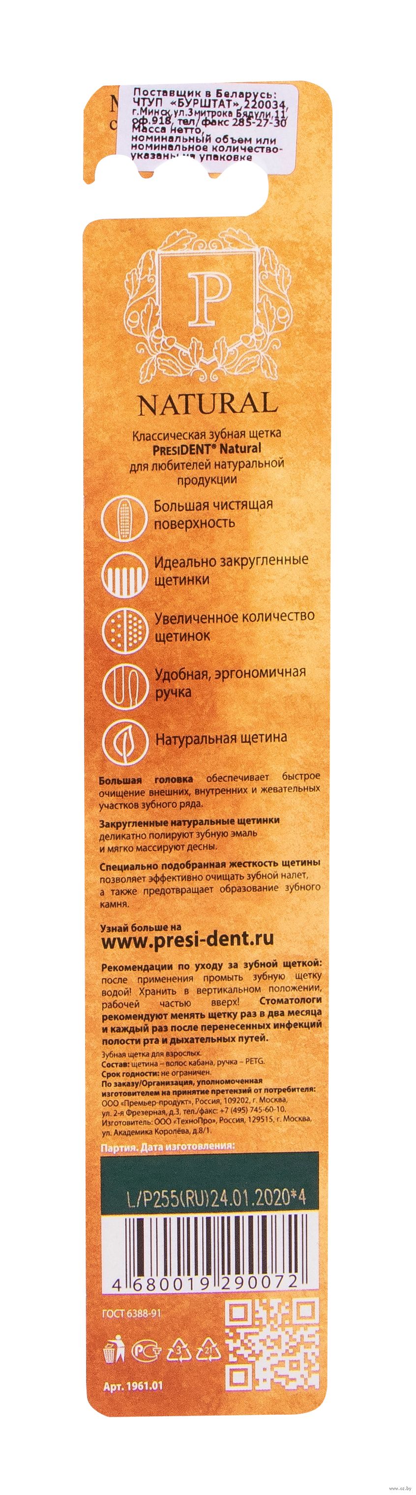 Зубная щетка с натуральной щетиной. Большая головка обеспечивает быстрое очищение внешних, внутренних и жевательных участков зубного ряда. Закругленные щетинки деликатно полируют зубную эмаль и не травмируют десны.