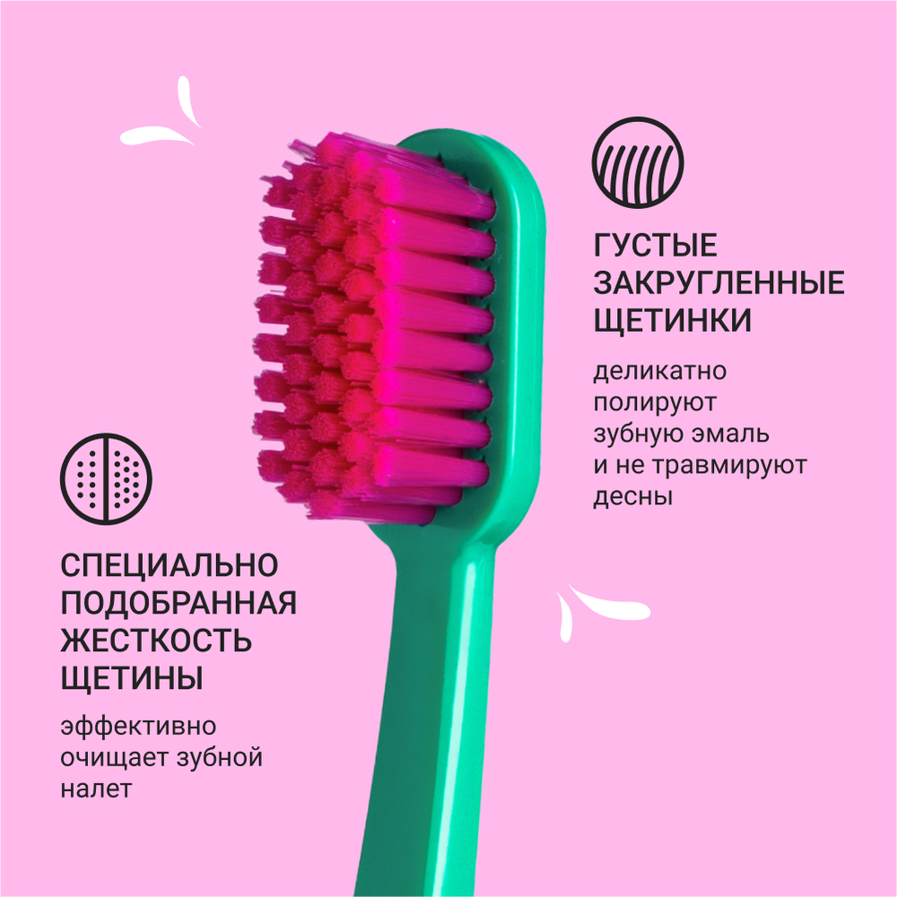 Густые, закругленные щетинки деликатно полируют зубную эмаль и не травмируют десны. Специально подобранная жесткость щетины эффективно удаляет зубной налёт при гиперчувствительности эмали.