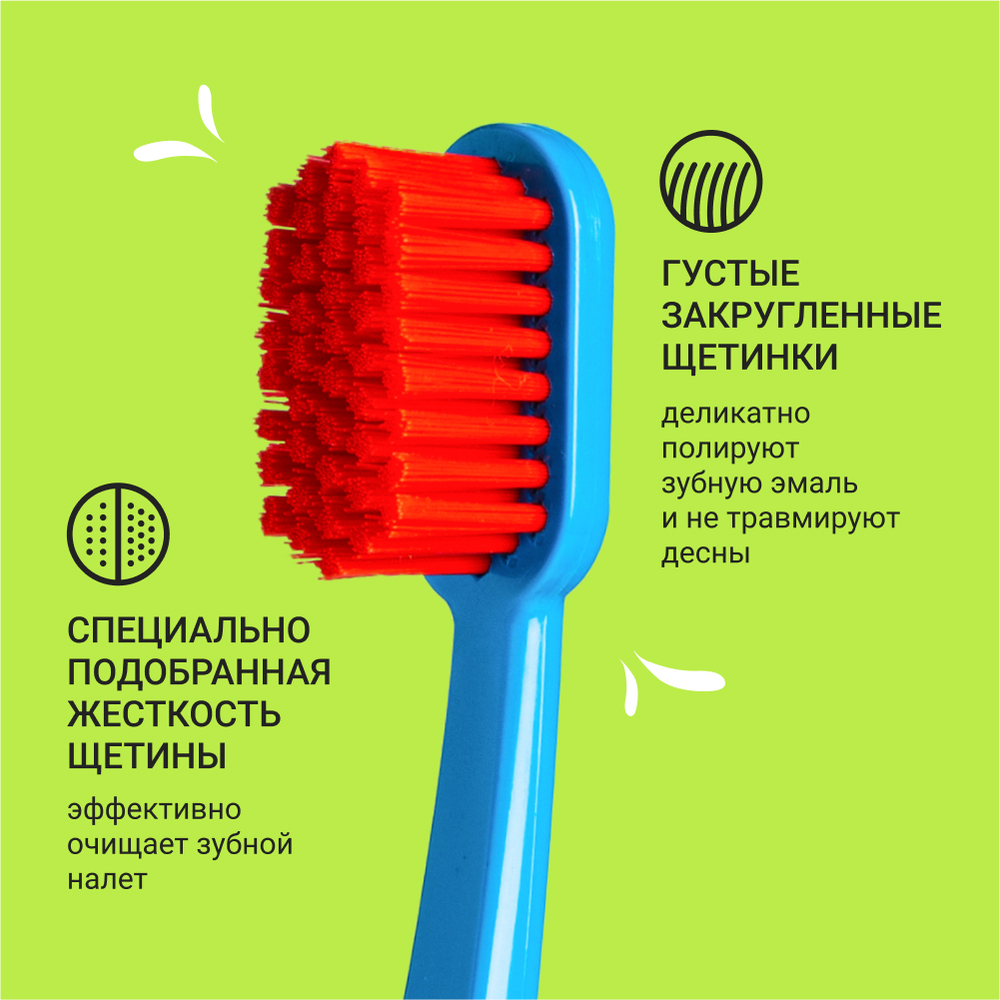Густые, закругленные щетинки деликатно полируют зубную эмаль и не травмируют десны. Специально подобранная жесткость щетины эффективно удаляет зубной налёт и предотвращает образование зубного камня.