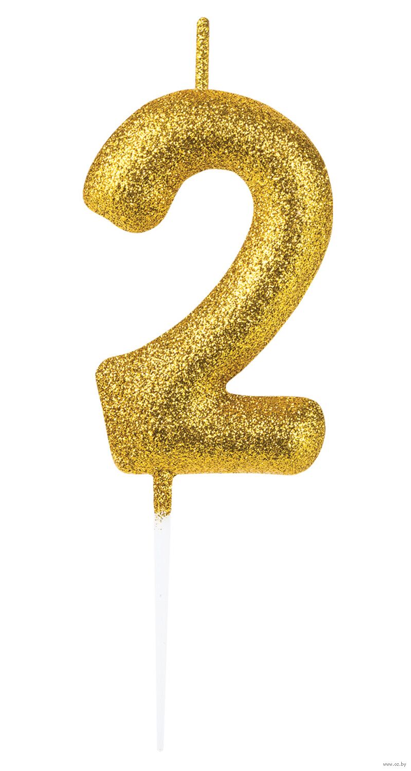 Свеча золотистого цвета декорирована глиттером и представляет собой цифру "2". Выполнена из парафина и укомплектована пластиковым держателем-шпажкой для удобства размещения цифры в торте или другом кондитерском изделии. Высота свечи – 6 см, длина шпажки – 4,5 см.