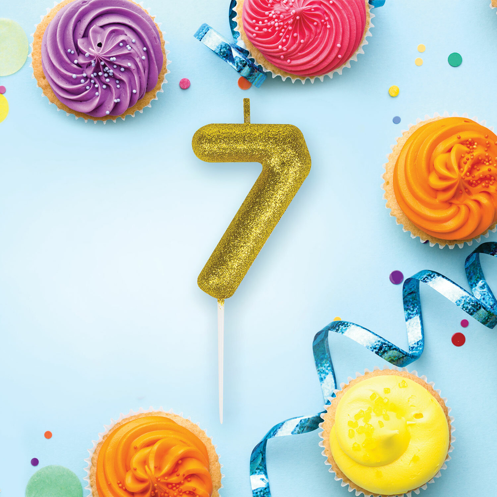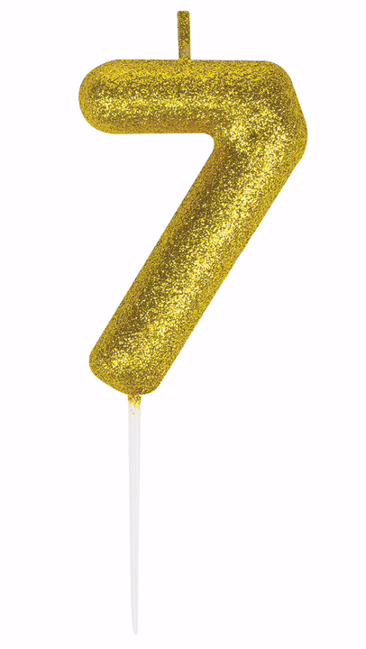 Свеча золотистого цвета декорирована глиттером и представляет собой цифру "7". Выполнена из парафина и укомплектована пластиковым держателем-шпажкой для удобства размещения цифры в торте или другом кондитерском изделии. Высота свечи – 6 см, длина шпажки – 4,5 см.