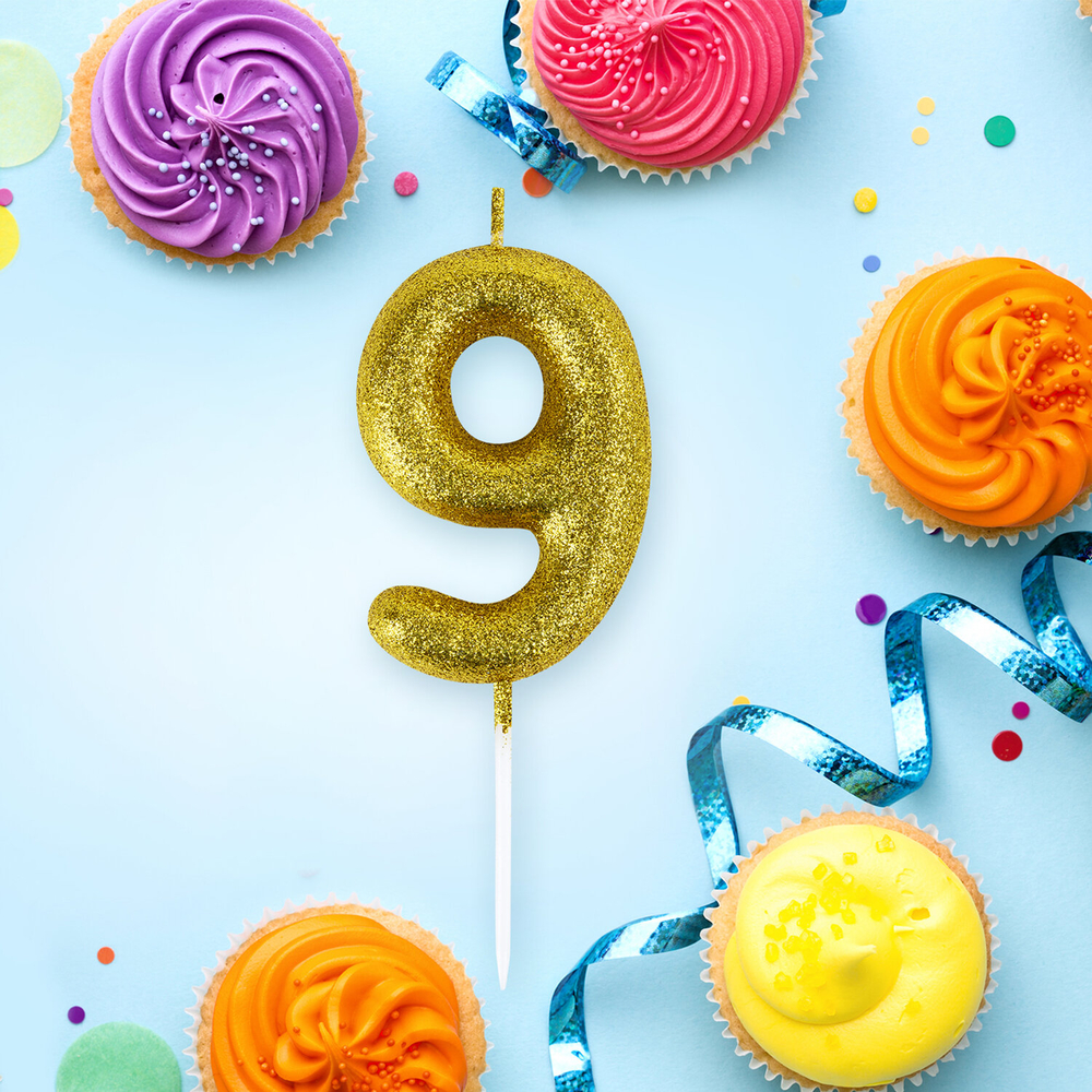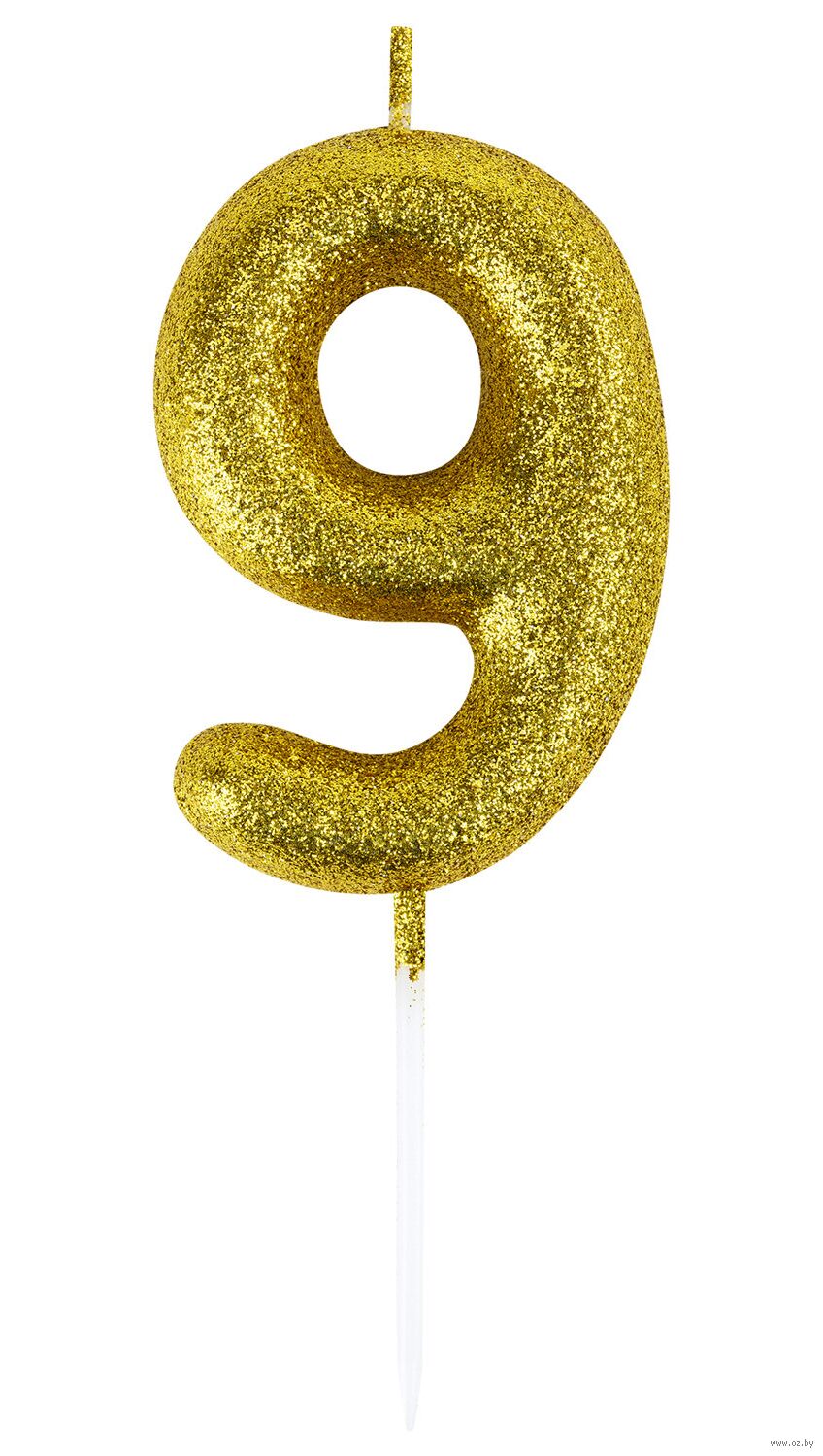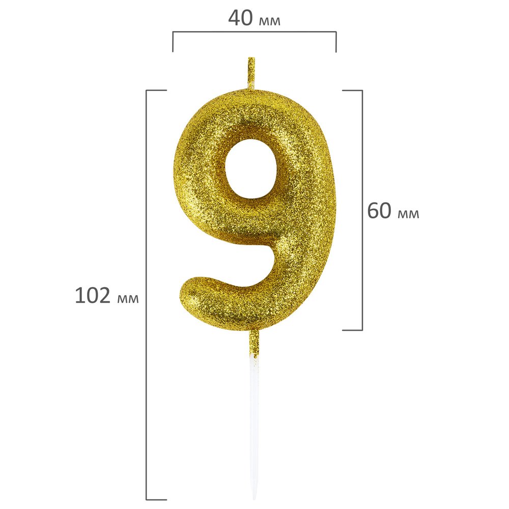 Свеча золотистого цвета декорирована глиттером и представляет собой цифру "9". Выполнена из парафина и укомплектована пластиковым держателем-шпажкой для удобства размещения цифры в торте или другом кондитерском изделии. Высота свечи – 6 см, длина шпажки – 4,5 см.