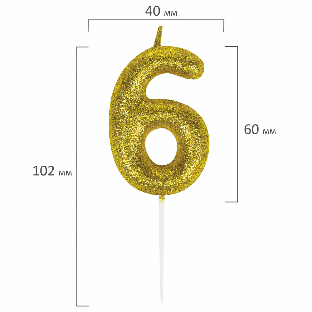 Свеча золотистого цвета декорирована глиттером и представляет собой цифру "6". Выполнена из парафина и укомплектована пластиковым держателем-шпажкой для удобства размещения цифры в торте или другом кондитерском изделии. Высота свечи – 6 см, длина шпажки – 4,5 см.
