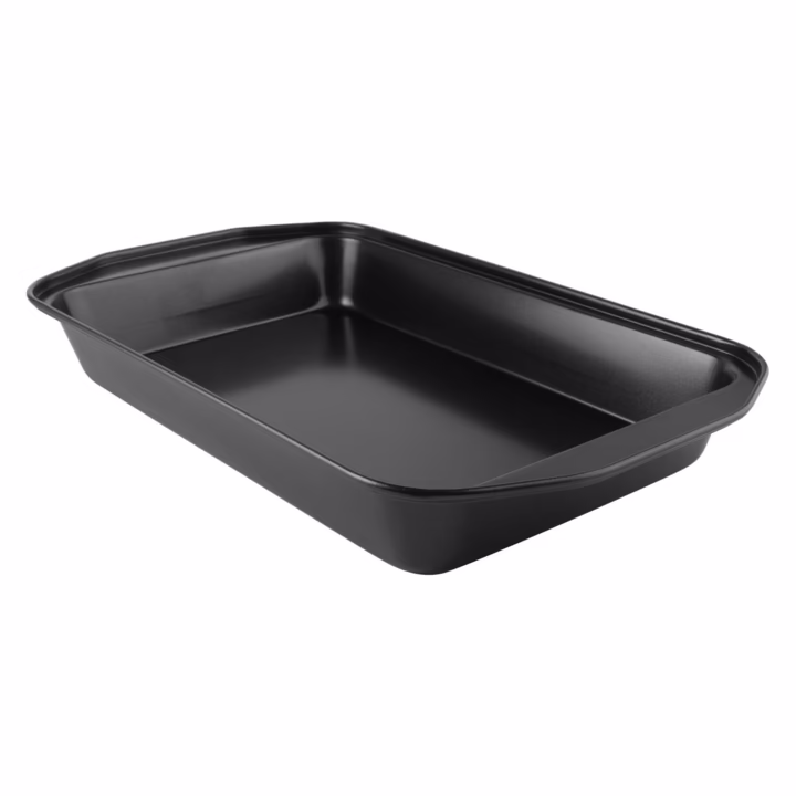 Прямоугольный противень изготовлен из прочной углеродистой стали с антипригарным покрытием. Максимальная температура использования составляет 220-240°C.