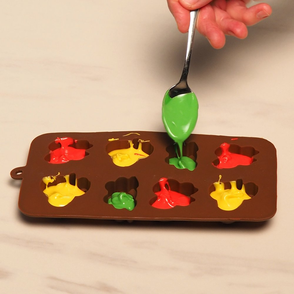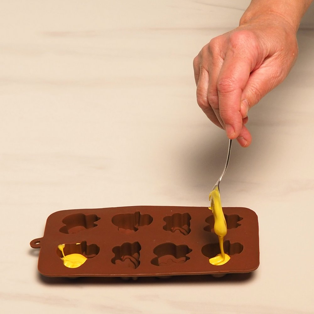 Растопите шоколад на паровой бане, залейте его в формочки и поместите в холодильник до полного застывания. По желанию добавьте в формочки орешки, кокосовую стружку или карамель. Привлекайте к творчеству детей – забавные животные точно понравятся юным кондитерам!