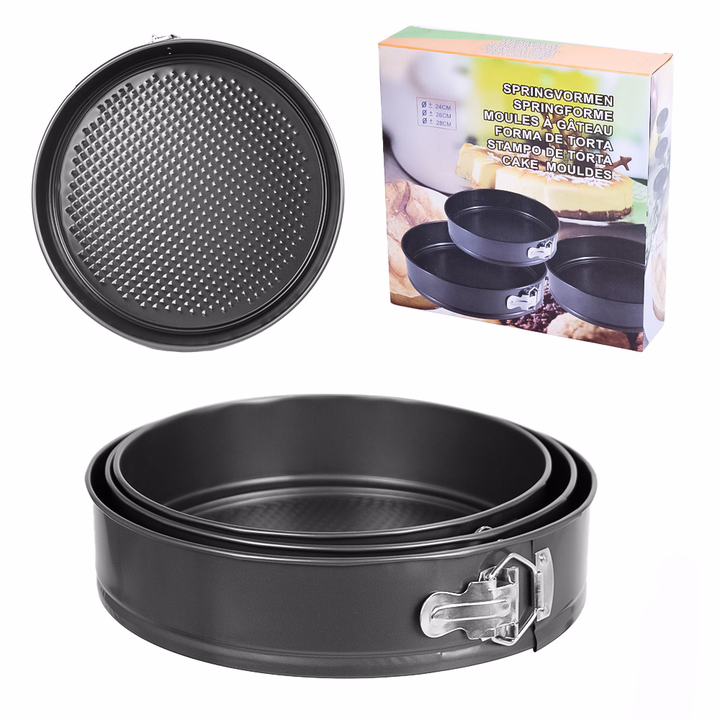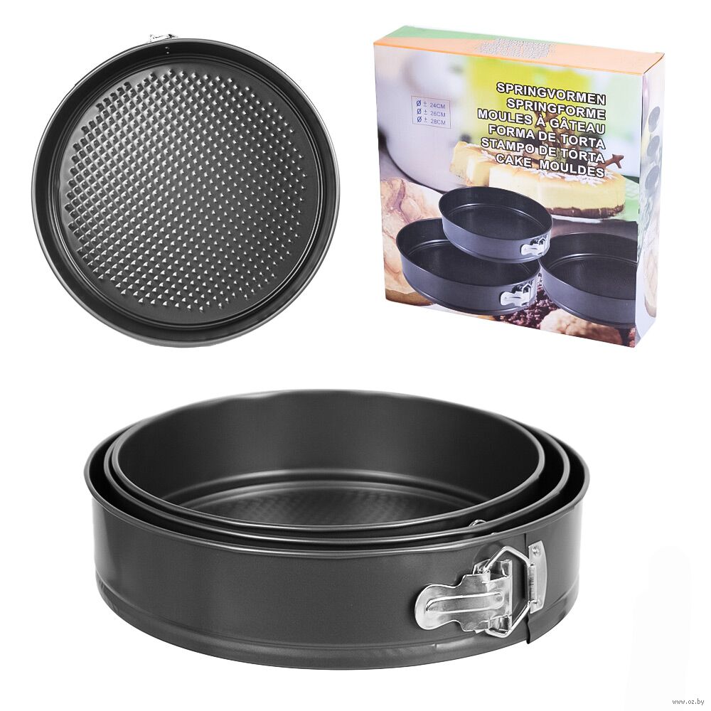 Набор разъемных форм для выпечки выполнен из прочной углеродистой стали с антипригарным покрытием. Можно использовать при максимальной температуре 220-240°C.
