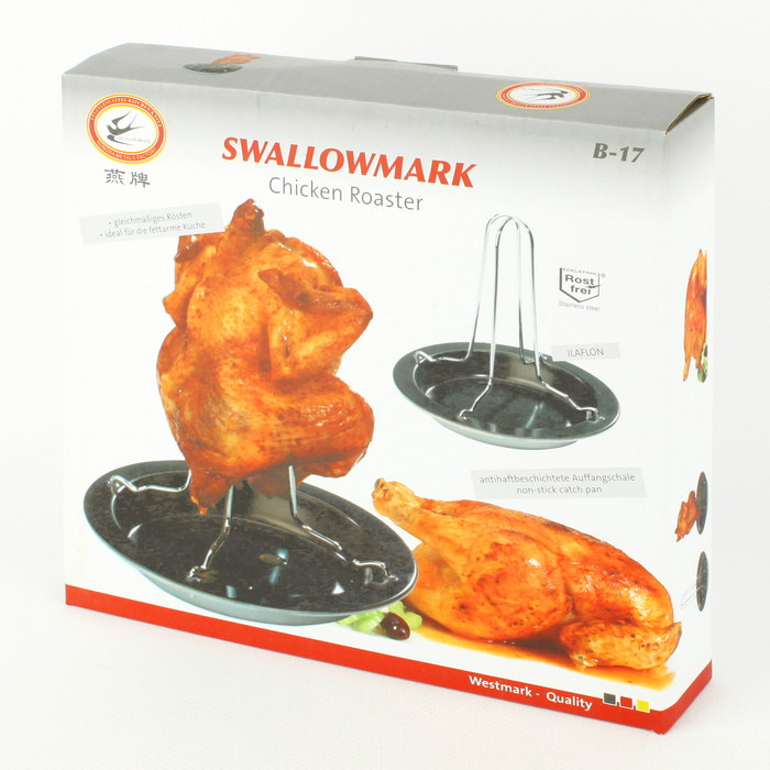 Такая вертикальная подставка устойчива и легко поджаривает курицу в положении стоя, позволяя жирам капать и пропитывать весь кусок птицы.