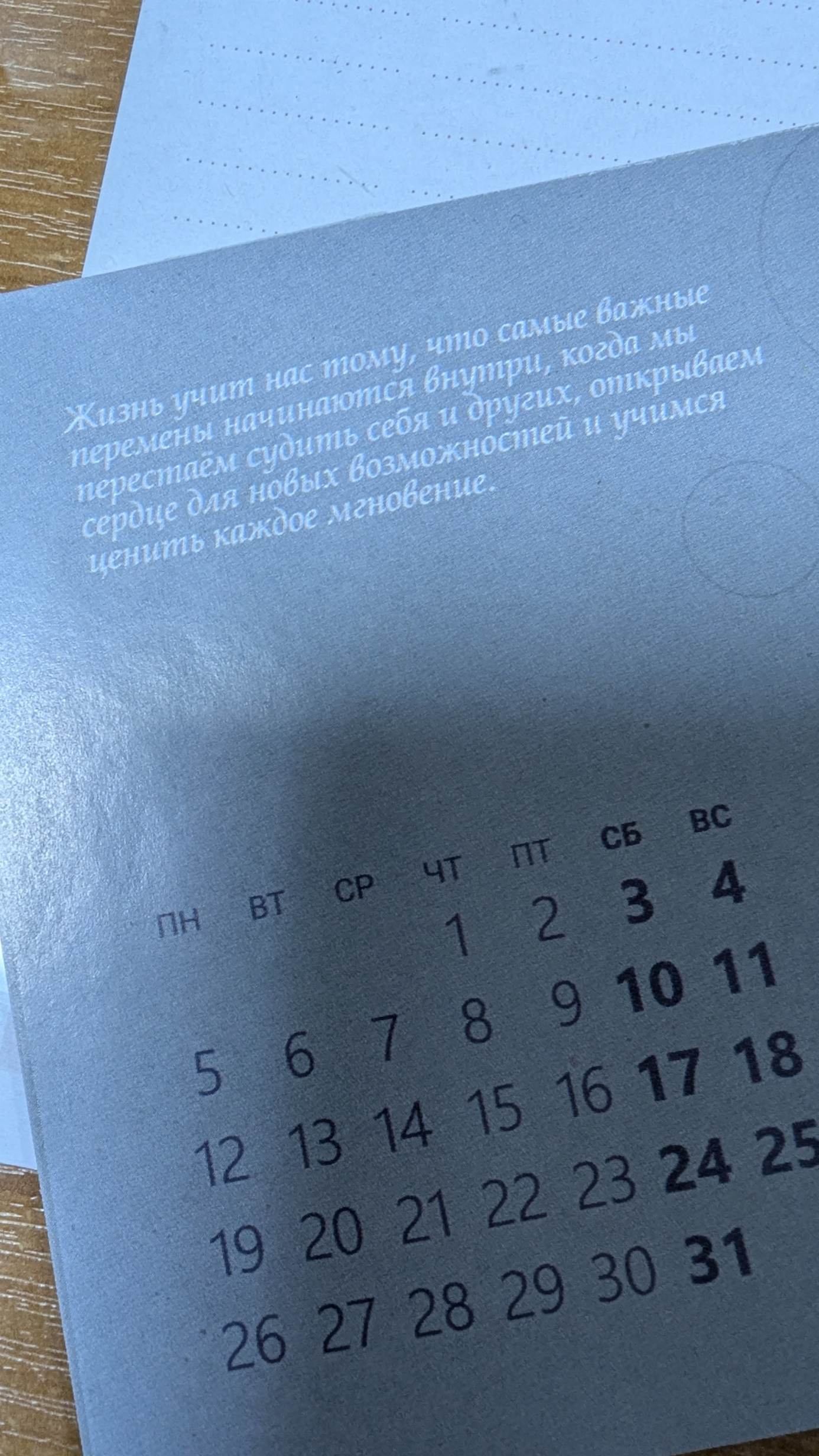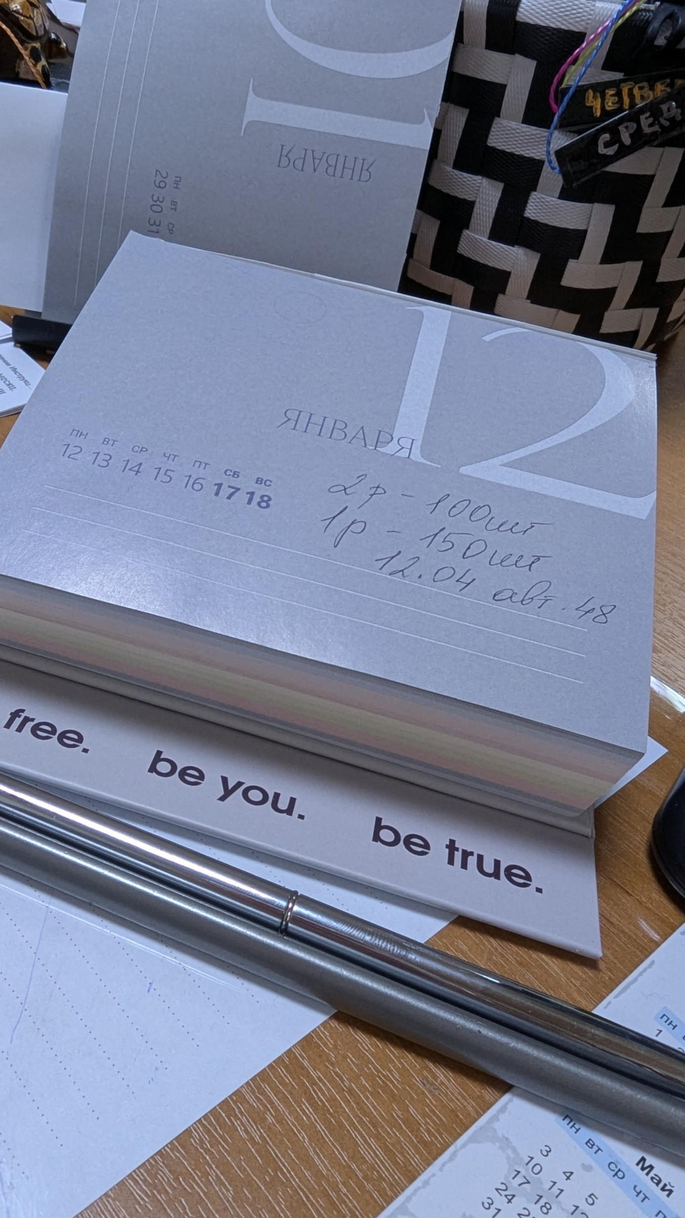 Захотела купить какой-нибудь отрывной календарь на работу и выбор пал на такой необычный вариант. Чуть-чуть помучилась с тем, как вообще использовать подставку, но благо сзади коробки есть инструкция, в итоге разобралась. Очень нестандартное исполнение, но мне понравилось. Календарь удобно стоит для того, чтобы делать на нем заметки (пока не пробовала, но по ощущению писать ручкой на этой бумаге можно легко). Ну и понравилось, что на странице видна целая рабочая неделя, все таки для планирования это важно. С нетерпением жду 2026 год, чтобы его использовать)
