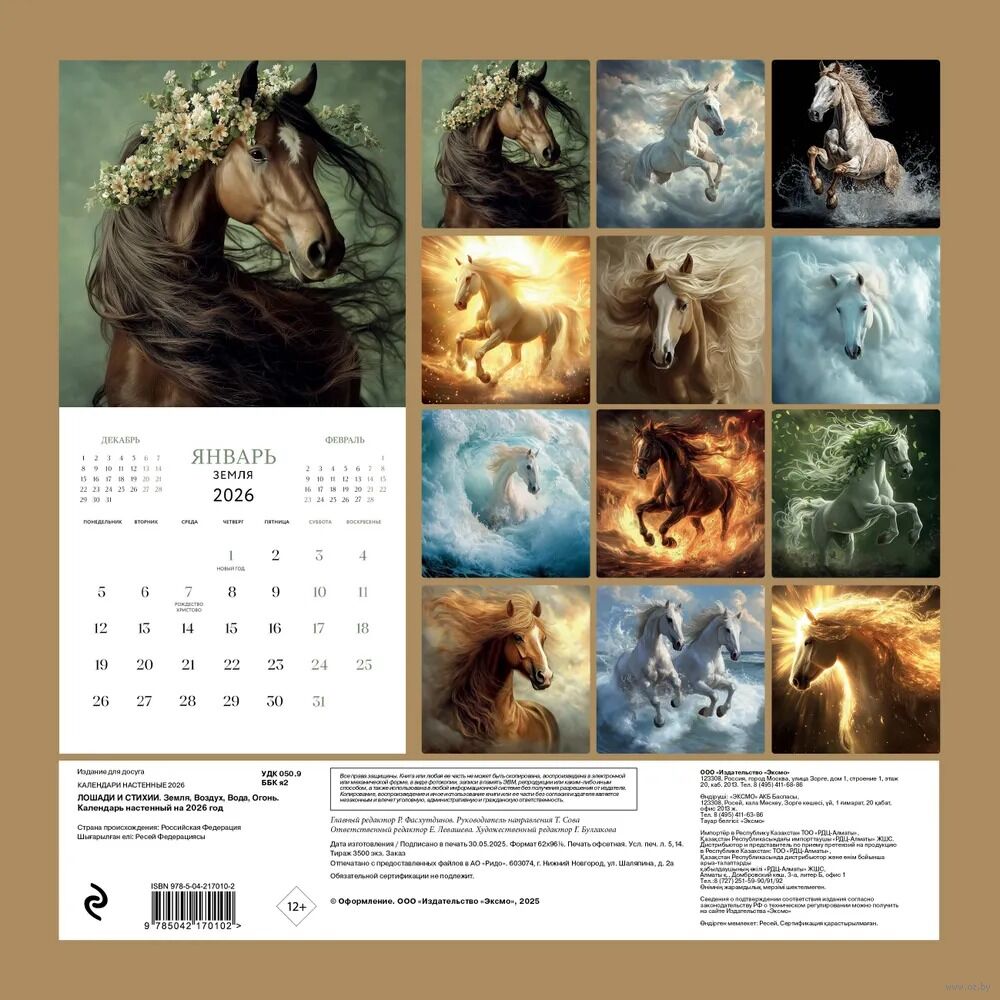 Календарь настенный на 2026 год "Лошади и Стихии. Земля, Воздух, Вода, Огонь" (30х30 см)