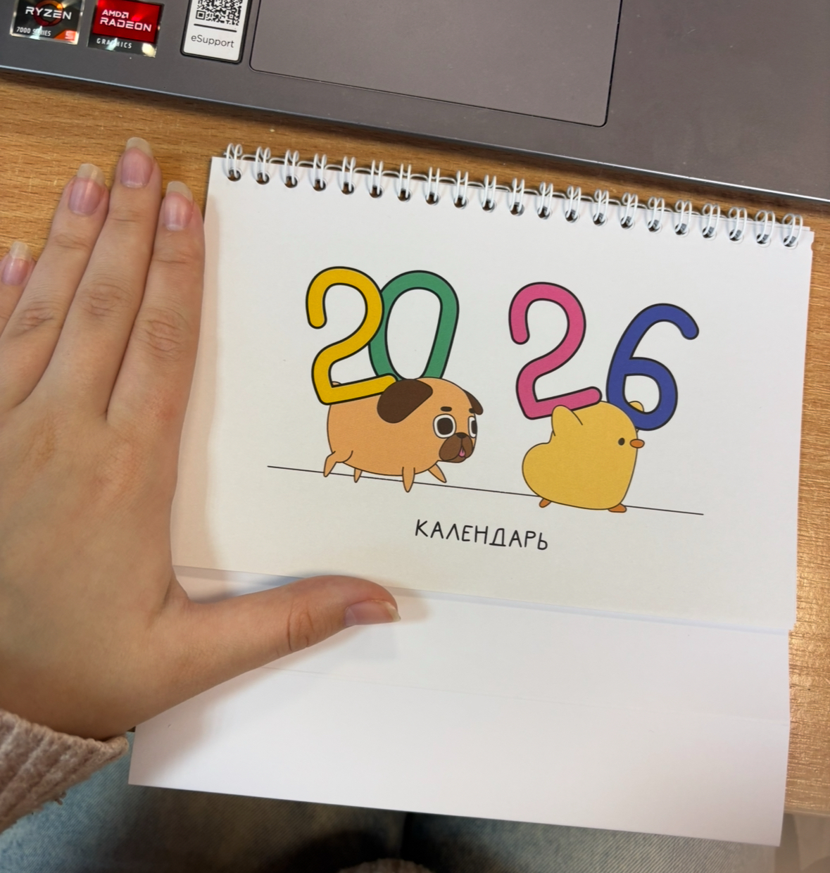 Купила себе календарь на работу для поднятия боевого духа в 2026 году. Он достаточно большой и плотный, очень понравились маленькие рисуночки на самом «календарике» и то, что «статусы» можно менять по велению левой пятки. Поэтому мне нравится, советую к покупке)