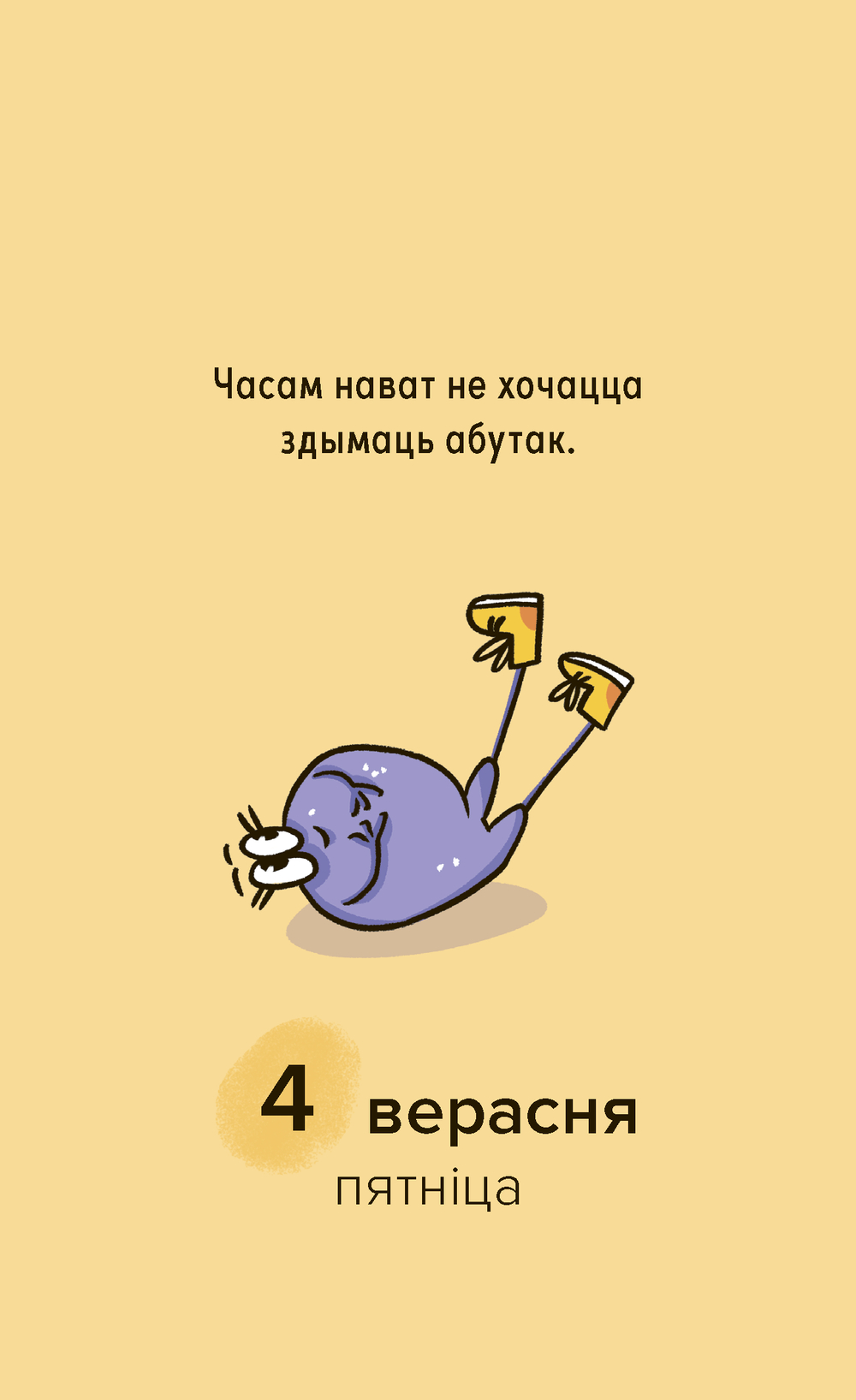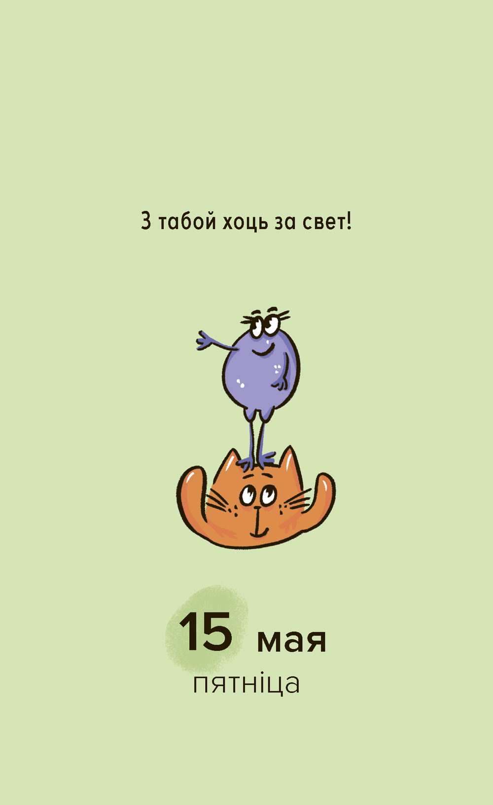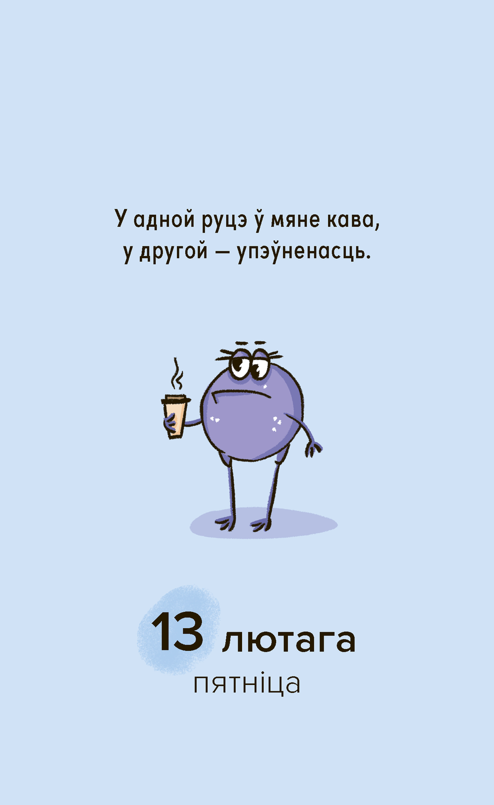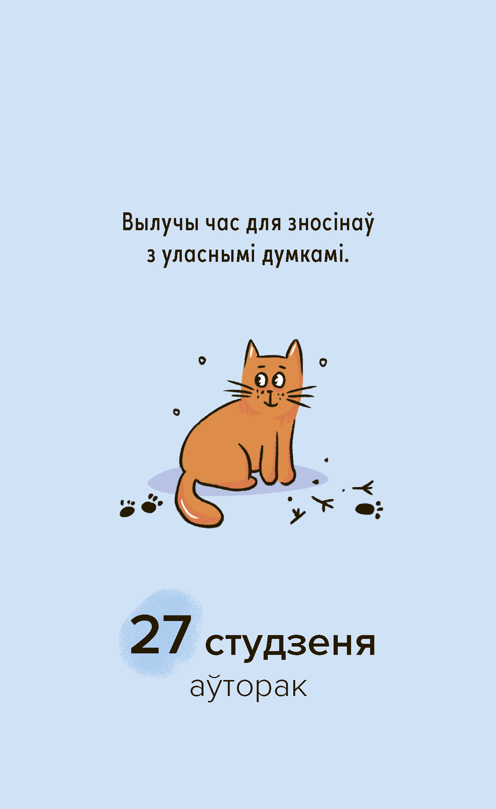 На старонках календара вас чакаюць фразы дня – мілыя, натхняльныя, часам жартоўныя, а таксама пацешныя персанажы, створаныя мастачкай Аляксандрай Атлас. У камплекце – ўніверсальныя стыкеры з гэтымі героямі! Упрыгожце імі сам каляндар або дадайце вясёлыя акцэнты ў свой штодзённік, на ноўтбук ці на чахол тэлефона.