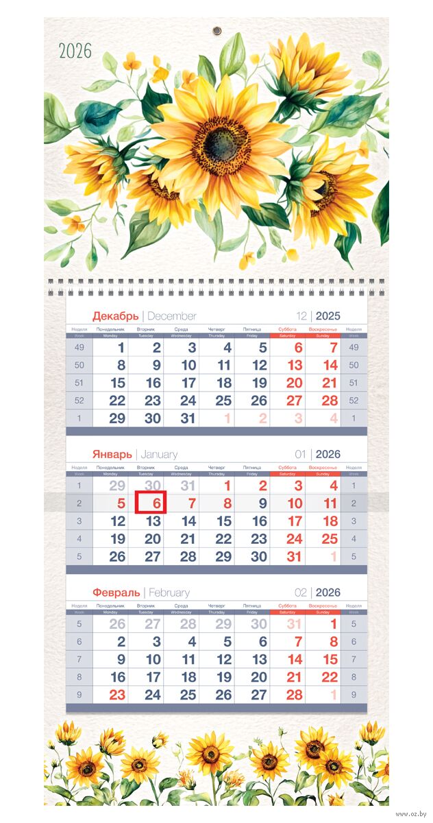 Календарь настенный квартальный на 2026 год "Подсолнухи" (19,5х44,5 см)