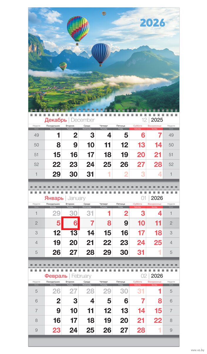 Квартальный календарь BG "Полёт" на 2026 год – помощник в планировании и украшение интерьера. Размер – 295х660 мм. Вертикальный календарь включает три блока, каждый из которых содержит 12 листов. Блоки держатся на трёх гребнях. Листы выполнены из офсетной белой бумаги плотностью 65 г/м² с использованием двухцветной печати. Подложка изготовлена из мелованного картона плотностью 320 г/м². Нижняя часть подложки напечатана в один цвет, а верхняя – полноцветная.
