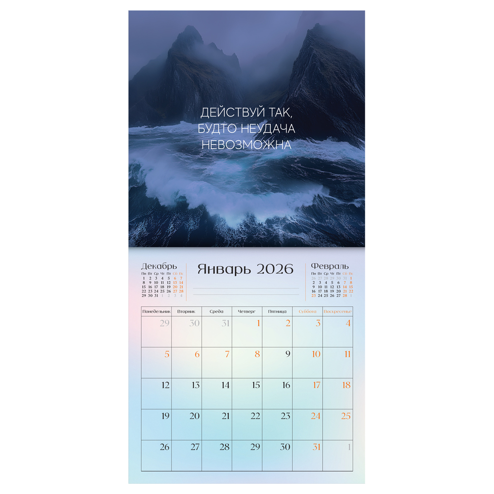 Каждый из 12 месяцев оформлен уникальными иллюстрациями, что создаёт вдохновляющую атмосферу. Оптимальный размер календаря позволяет легко разместить его в помещении, а надежная скрепка обеспечивает простоту в использовании. Индивидуальная упаковка – пакет.