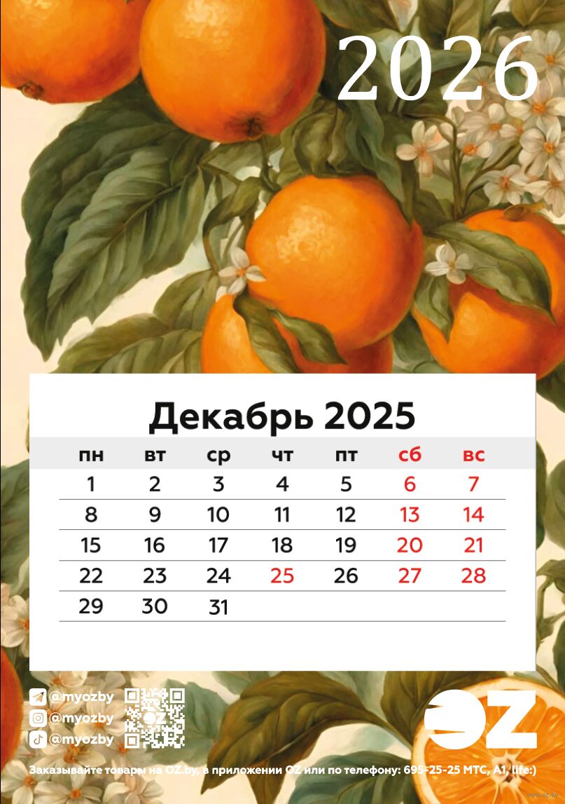 Календарь на магните на 2026 год "Спелые апельсины" (9,5х13,5 см)