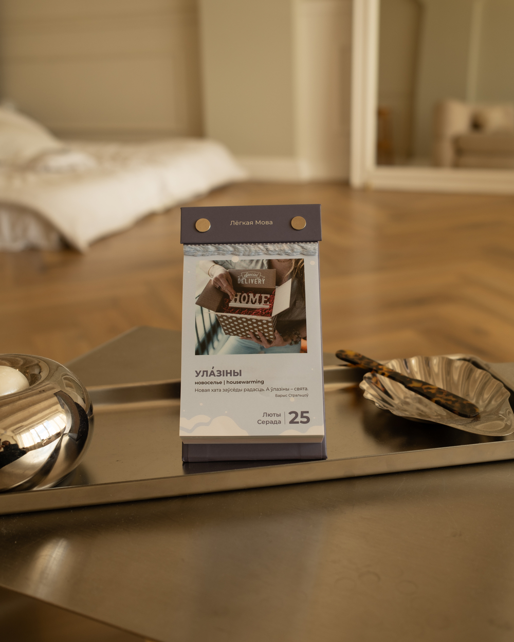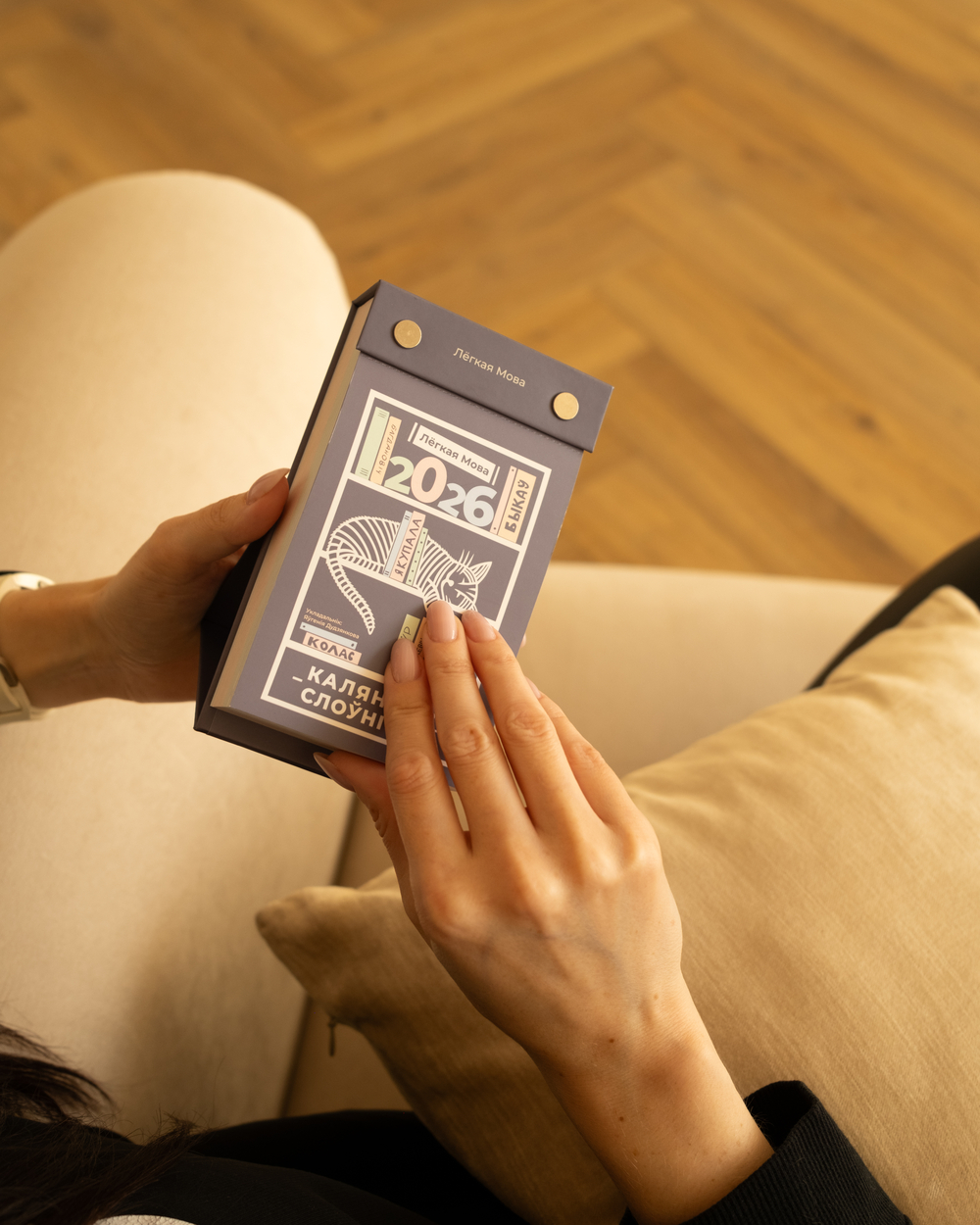 Очень полезная и интересная вещь! Я, естественно, уже пролистала его до конца и столько новых слов обнаружила! Конечно же, я листочки отрывать не буду, а поступлю, как раньше делал дедушка в деревне: буду просто переворачивать странички и фиксировать резинкой))). Оформление приятное - и глазу, и наощупь. Эта вещь будет полезна всем, кто учит беларусский и английский языки. Беларусские слова также подкрепляются литературными цитатами. Рекомендую однозначно! В нашей семье календарь понравился всем)