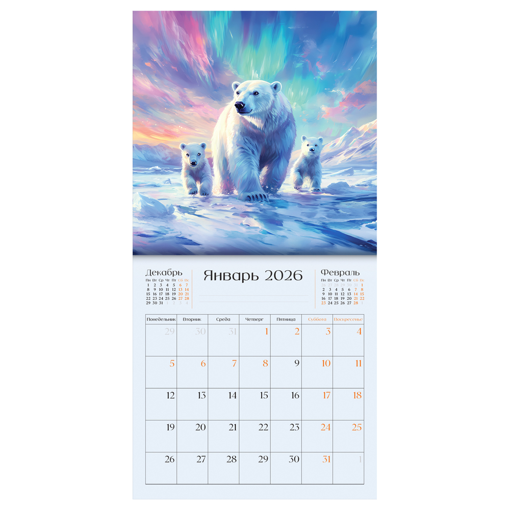 Настенный перекидной календарь на скрепке на 2026 год – это идеальное сочетание функциональности и эстетики, которое преобразит интерьер. Размер – 29х29 см. Изготовлен из мелованной бумаги плотностью 105 г\м2 с полноцветной печатью.