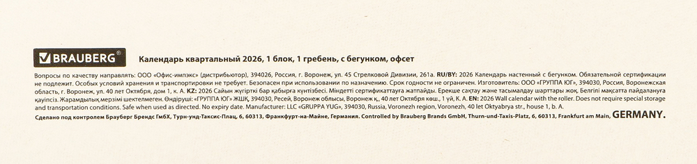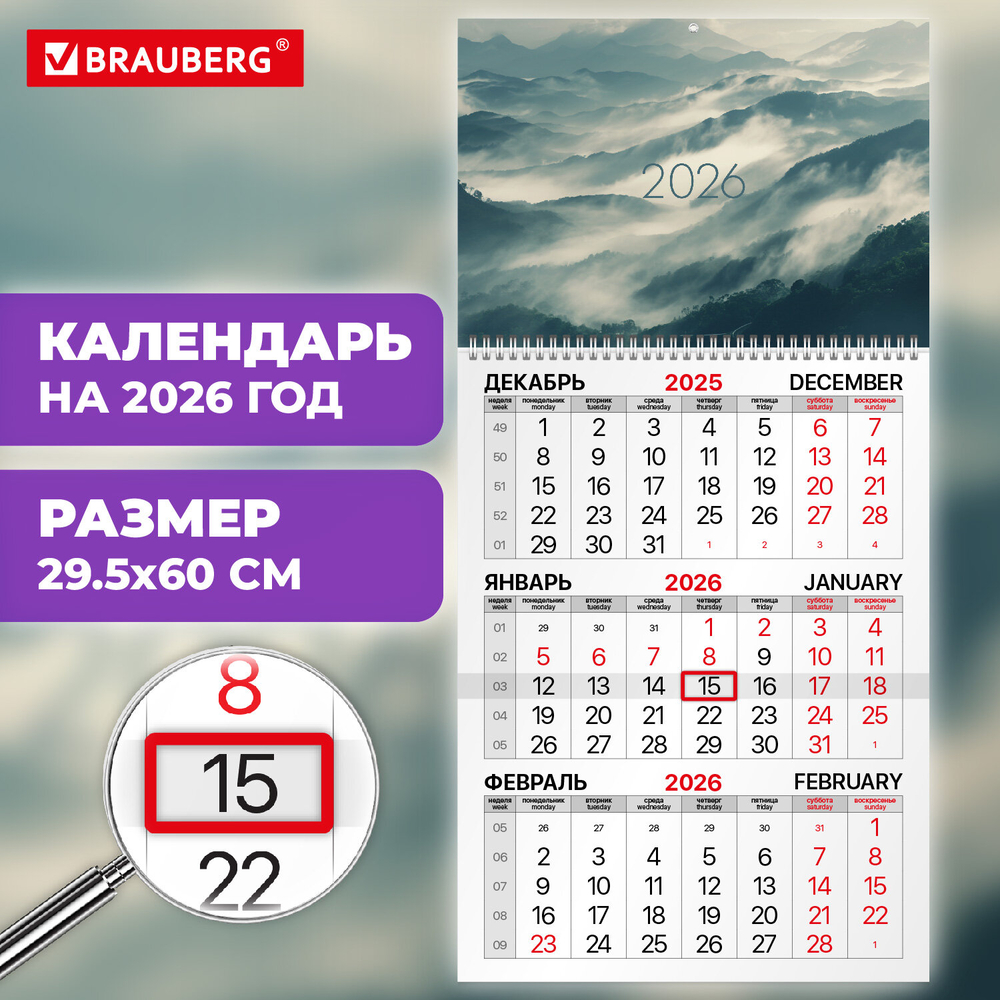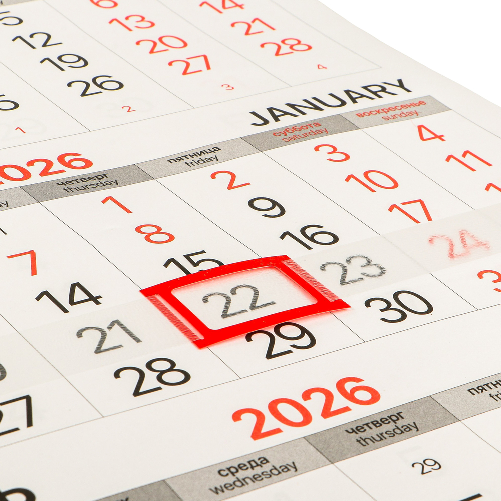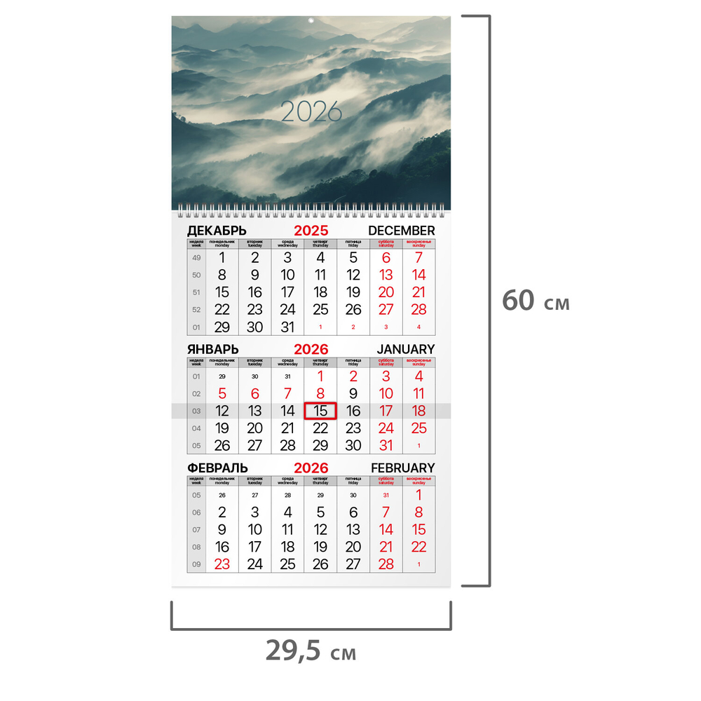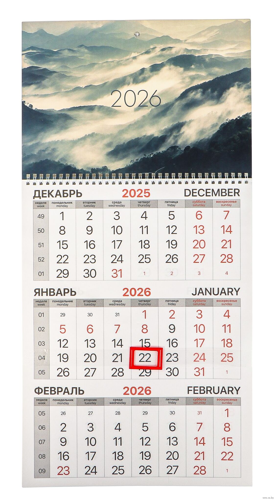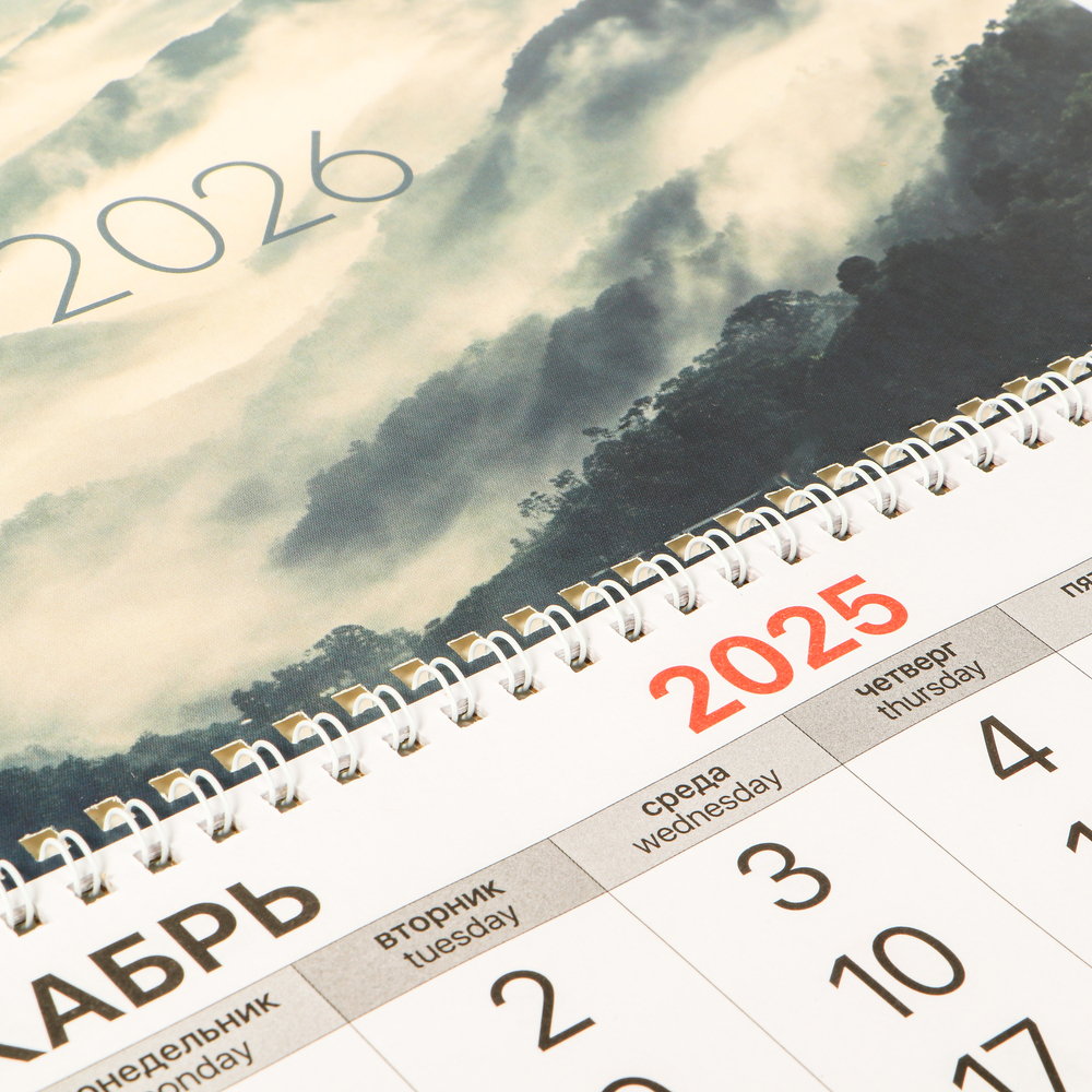 Офисный календарь на 2026 год на гребне. Состоит из 1 блока с календарными сетками на три месяца – предыдущий, текущий и последующий. Блок календаря напечатан на офсетной бумаге плотностью 65 г/м2. Подложка изготовлена из картона плотностью 280 г/м2. Курсор-бегунок выделяет текущую дату. Вертикальный формат. Размер – 29,5х60 см.