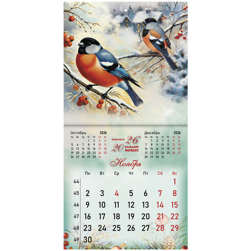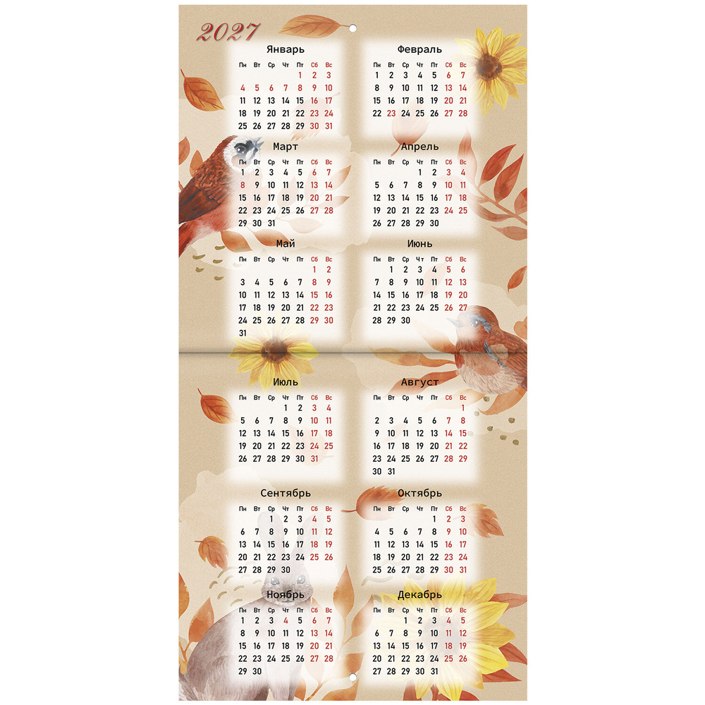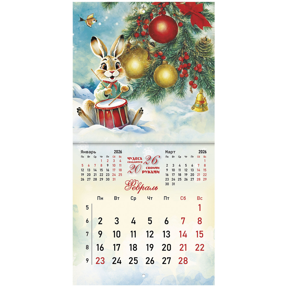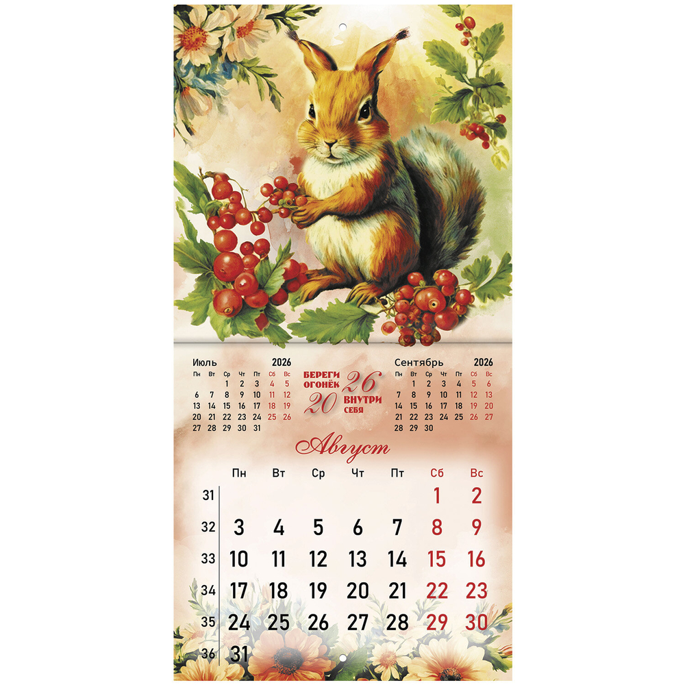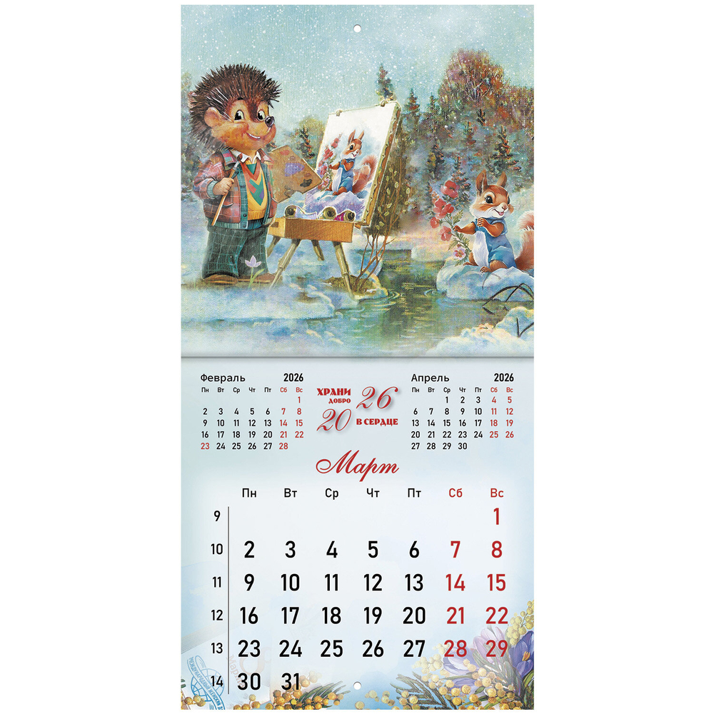 Настенный календарь на скрепке, содержит 12 страниц. Яркая, красочная картинка дополнена календарной сеткой на месяц. Блок календаря напечатан на мелованной бумаге плотностью 130 г/м2. Оригинальная обложка изготовлена из мелованной бумаги плотностью 230 г/м2. Размер – 21,4х21,4 см, в развороте – 21,4х42,8 см. Дополнен отверстием для удобства крепления. Поставляется в индивидуальной упаковке (полибэг) с европодвесом и прокладкой из гофрокартона, что создает товару дополнительную защиту.