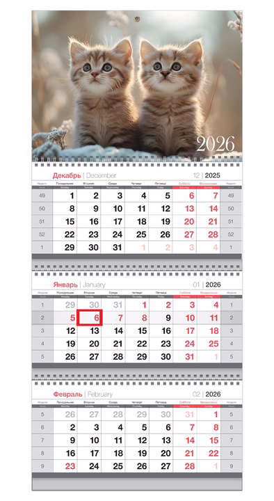 Квартальный календарь "Котята" на 2026 год – отличный инструмент для планирования в офисе и дома. Размер календаря – 195х445 мм. Ориентация – вертикальная. Календарь состоит из трёх блоков по 12 листов, закреплённых на трёх гребнях.