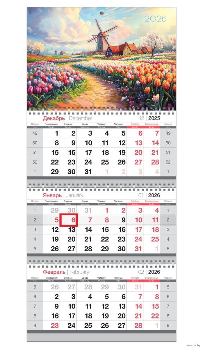 Квартальный календарь "Мельница" на 2026 год – помощник в планировании и украшение интерьера. Размер – 295х660 мм. Вертикальный календарь включает три блока, каждый из которых содержит 12 листов.