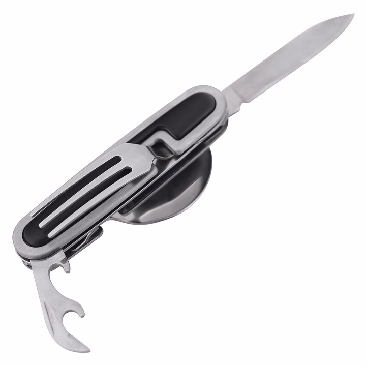 Незаменим в походе, на рыбалке и охоте. Компактность и многофункциональность оптимально совмещены в одном изделии. Помимо традиционных функций: нож, открывалка для бутылок и консервный нож, есть ложка и вилка.