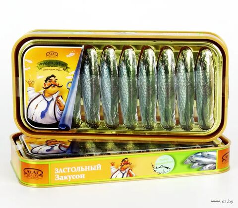 Конфеты упакованы в оригинальную коробку из твердого пластика. Такая упаковка – отличный способ сохранности конфет и их безопасной транспортировки. Оформление коробки имеет сходство с жестяной банкой со шпротами, которая закрыта прозрачной крышкой. Через прозрачное окно в крышке можно рассмотреть содержимое.