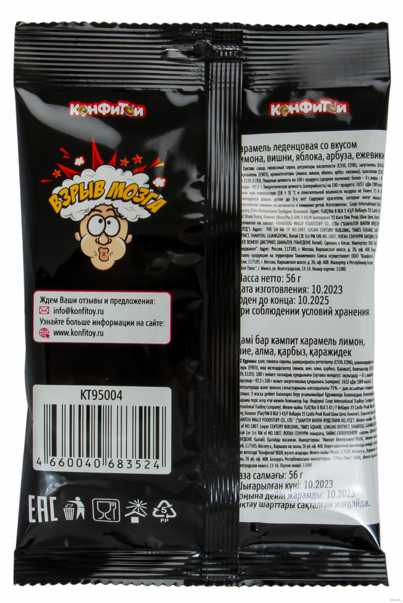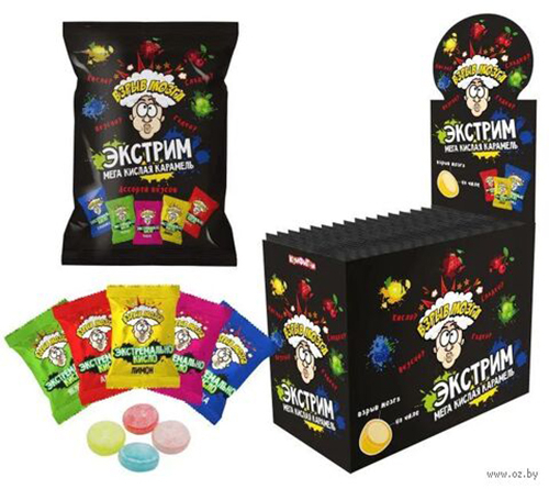 Эта мега кислая карамель состоит из двух слоев: экстремально кислой оболочки, вкус которой держится до 60 секунд, и сладкого центра.