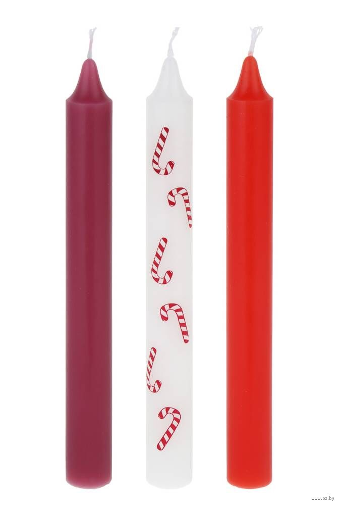 В комплекте три свечи: две насыщенно-красные и одна белая с забавным принтом "леденцовые палочки" – идеальное сочетание для рождественского или новогоднего декора.