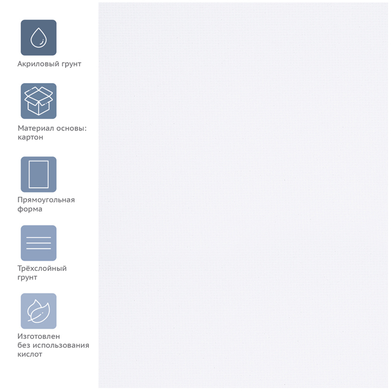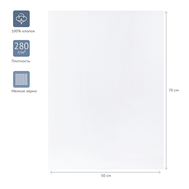 Холст прямоугольной формы плотностью 280 г/м2, размер – 50х70 см. Холст имеет акриловый грунт. Изготовлен без использования кислот.