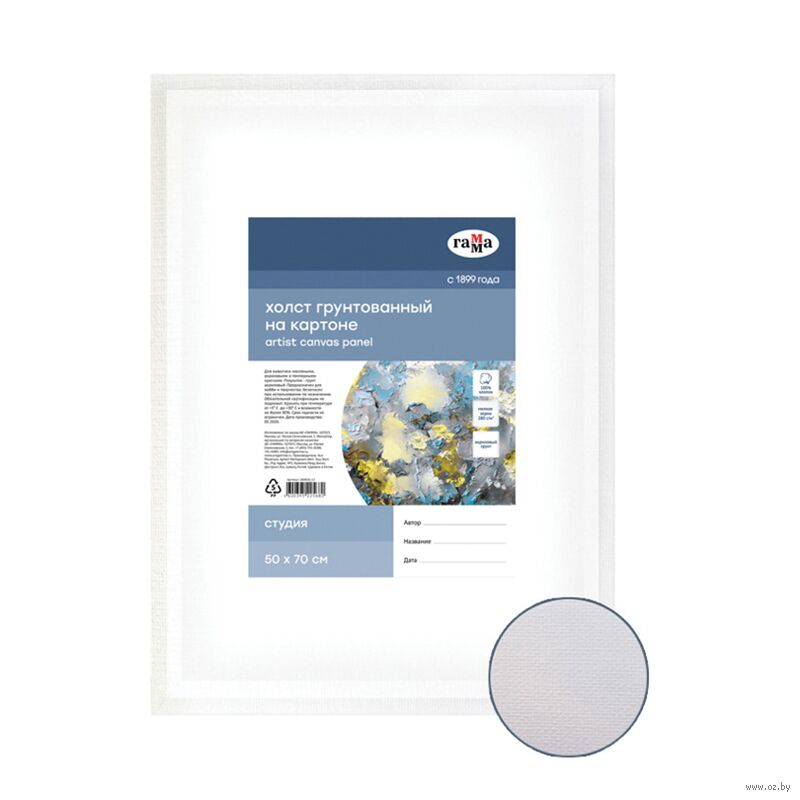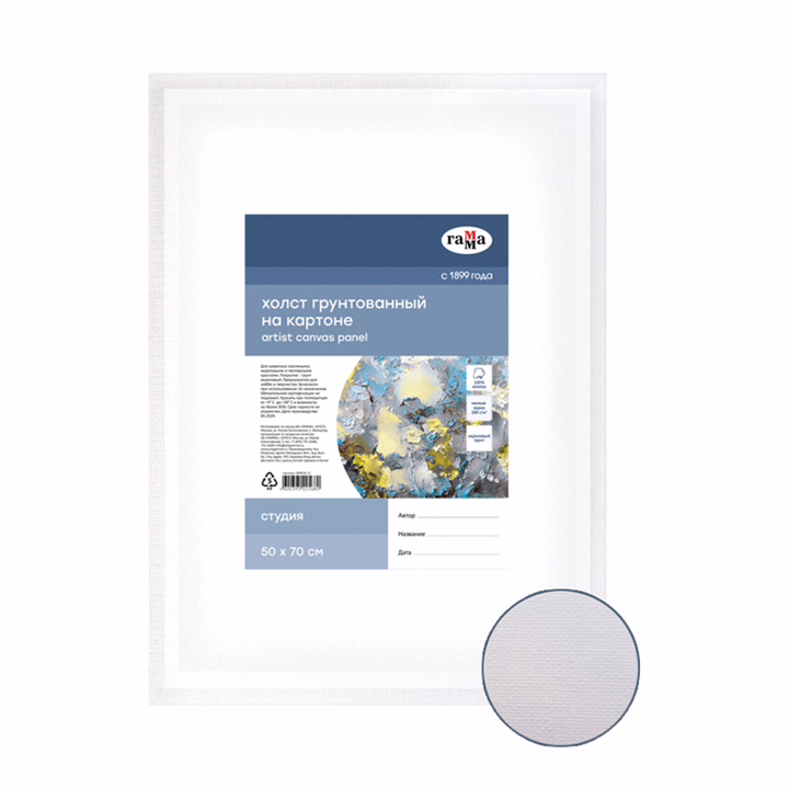 Хлопковый холст серии "Студия", грунтованный на картоне, подойдёт для живописи масляными, акриловыми, гуашевыми и темперными красками. Основа – натуральное полотно, 100% хлопок, мелкое зерно.