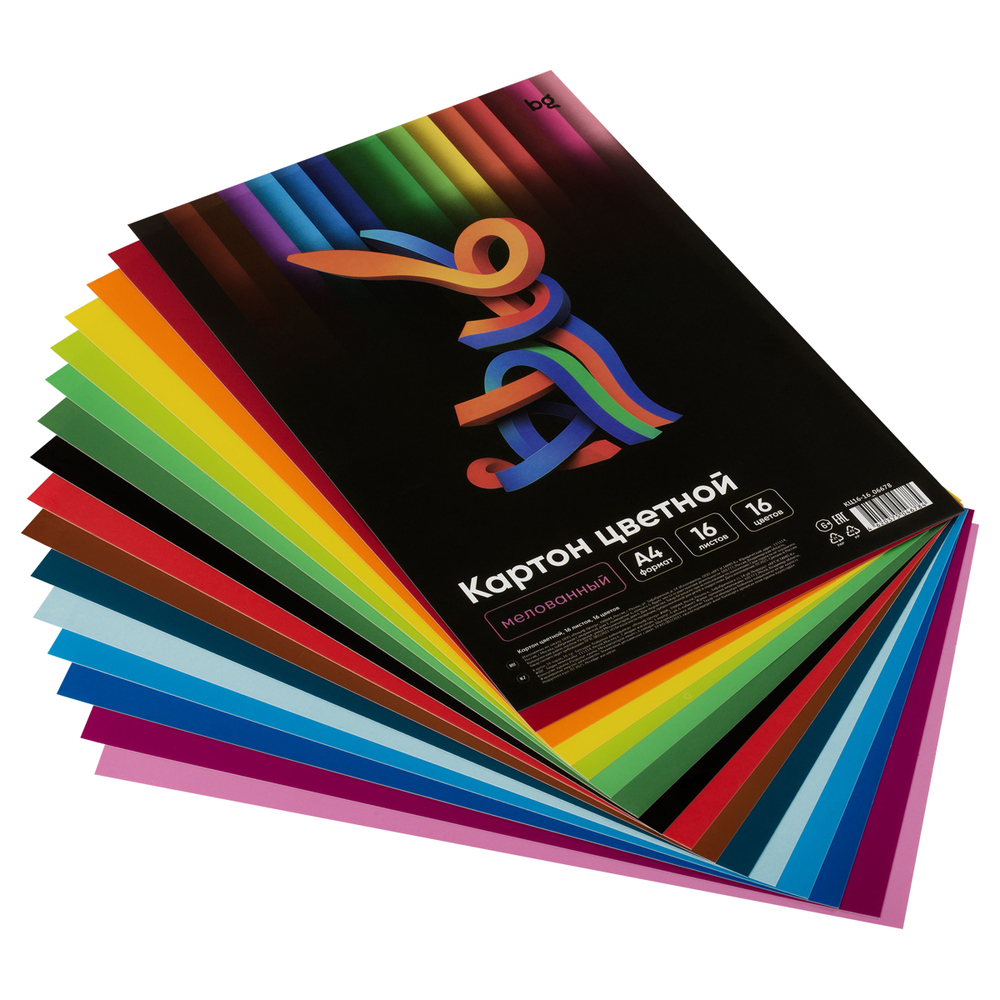 Цветной картон "BG" включает в себя 16 листов высококачественного мелованного целлюлозного картона с глянцевой поверхностью и цветовую палитру в 16 разнообразных цветов.