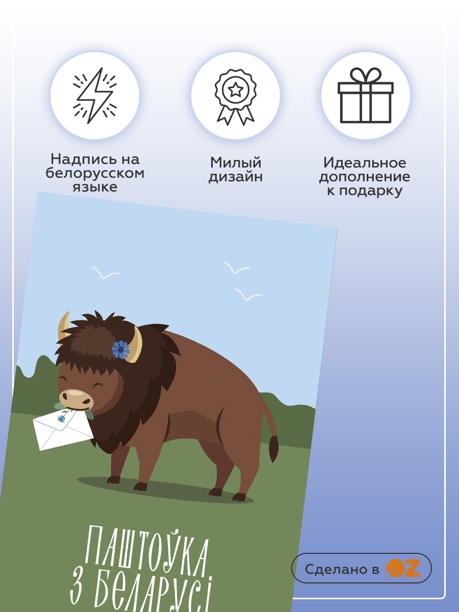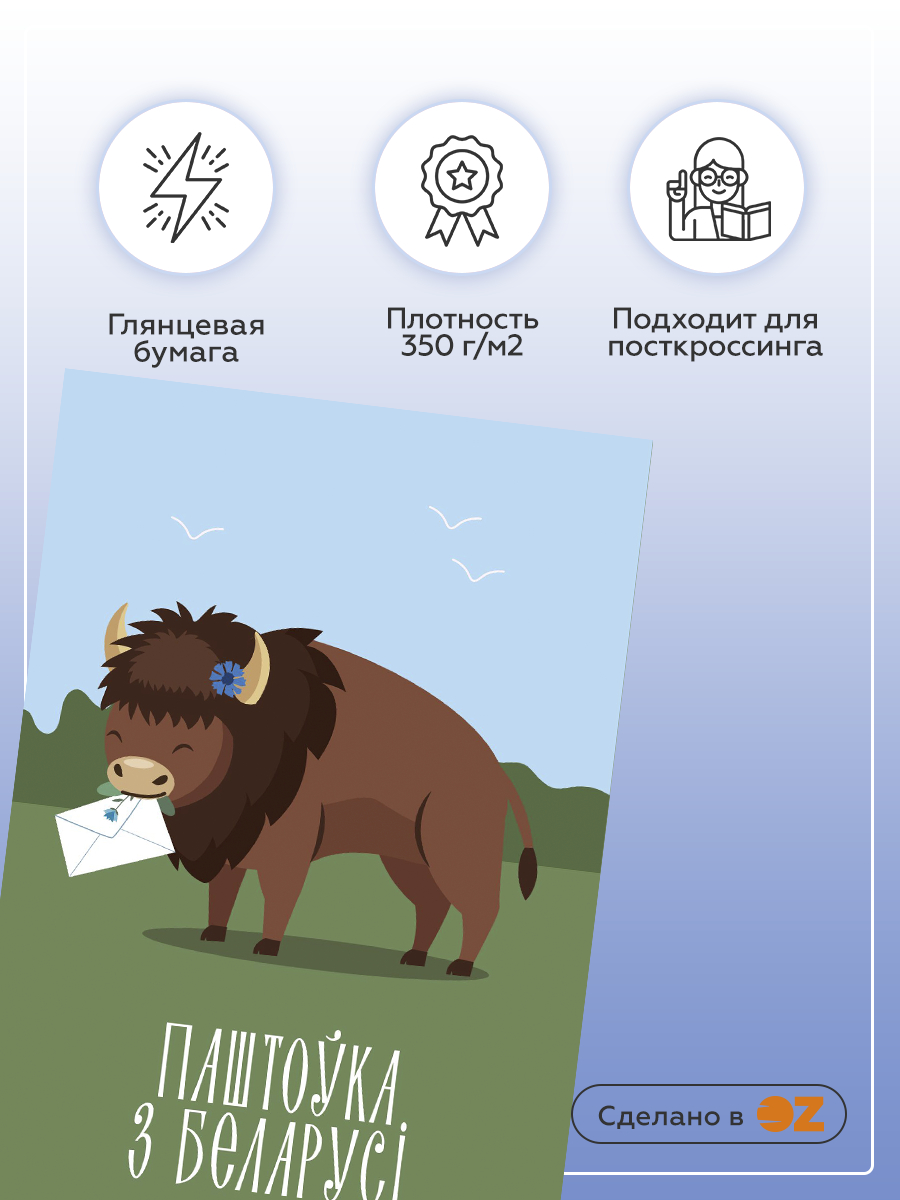 Паштоўка адпавядае паштовым стандартам. Шчыльная глянцавая папера вытрымае ўсе паштовыя прыгоды, а калі вам захочацца "абараніць" паштоўку ад штэмпеляў, перагібаў і выпадковых плям, яна выдатна змесціцца ў канверт.