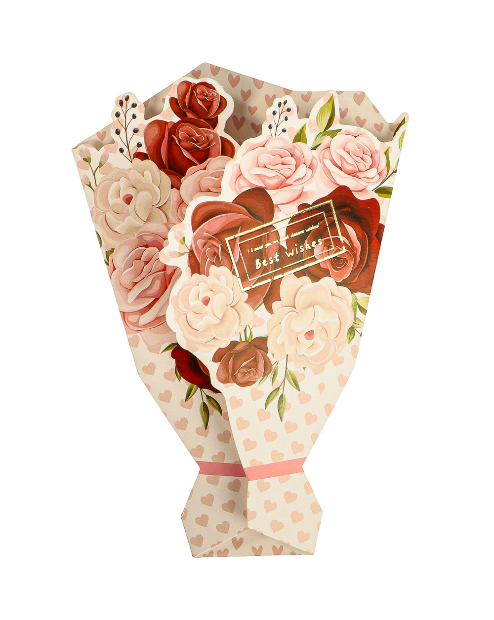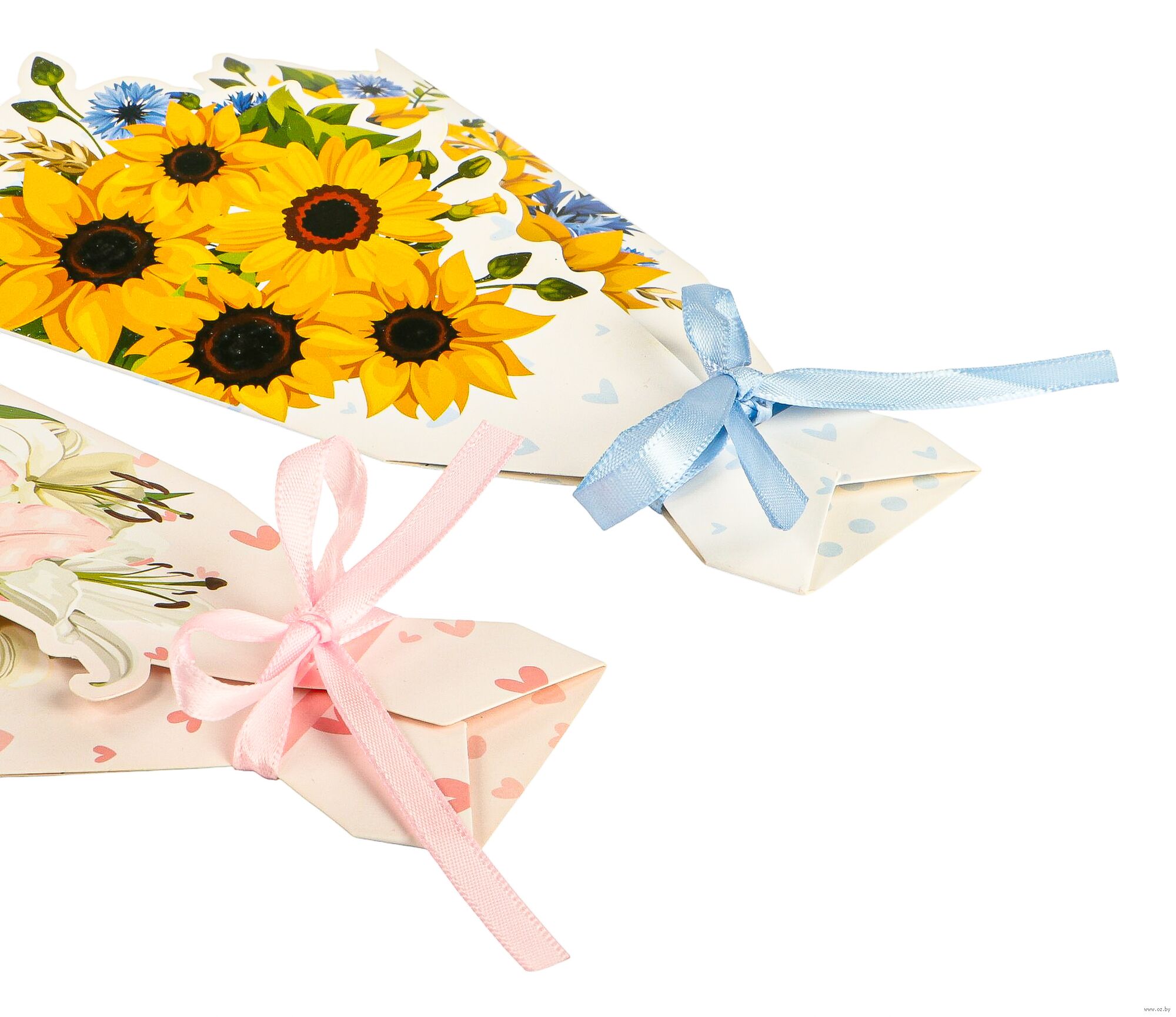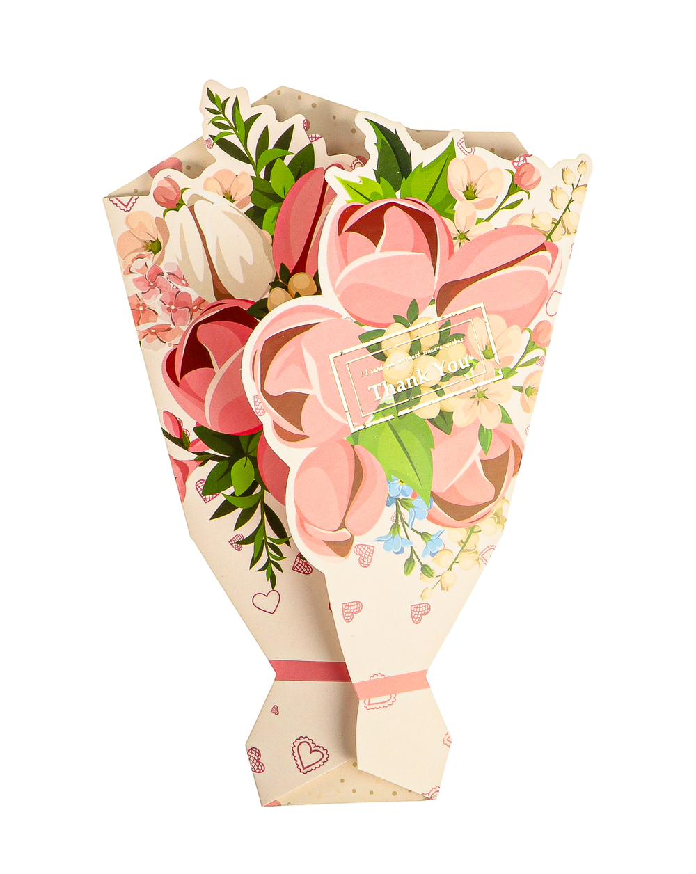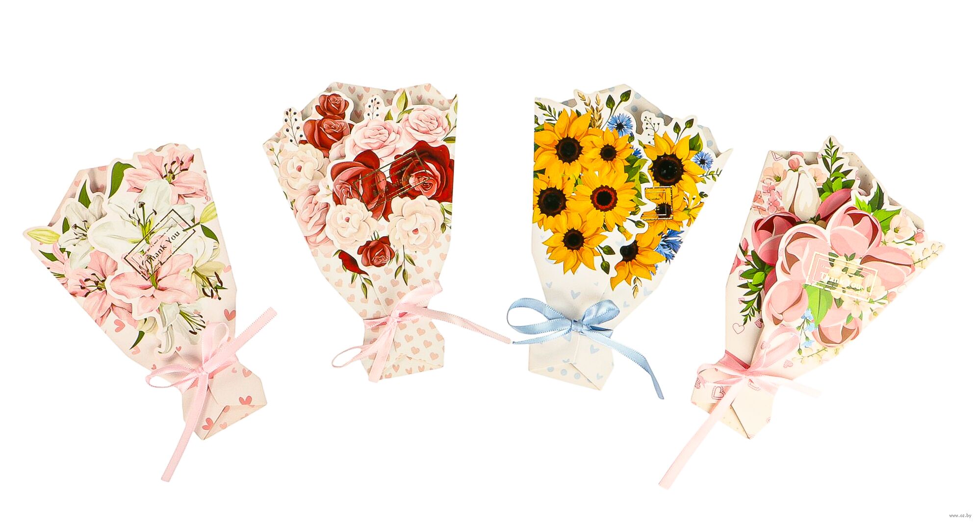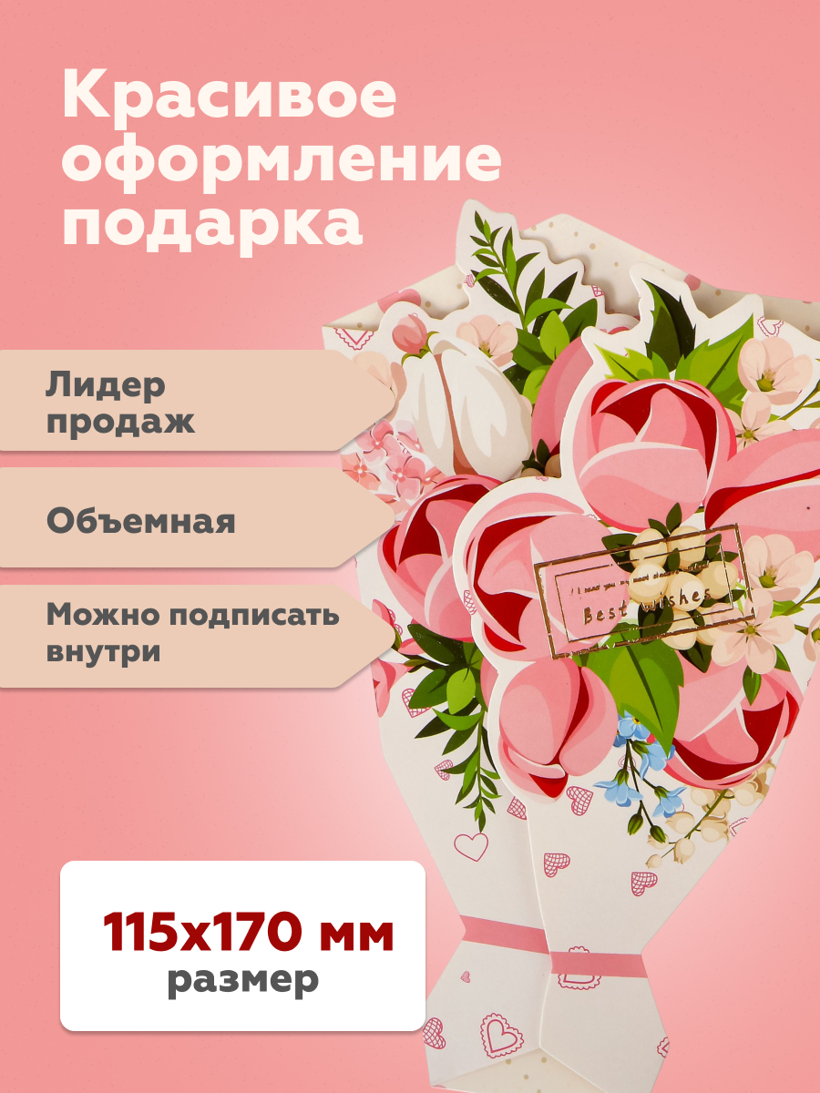 Открытка оформлена в уникальной 3D-технике, создавая эффект объемного букета цветов. Яркие и детализированные изображения выглядят так, будто цветы живые.
